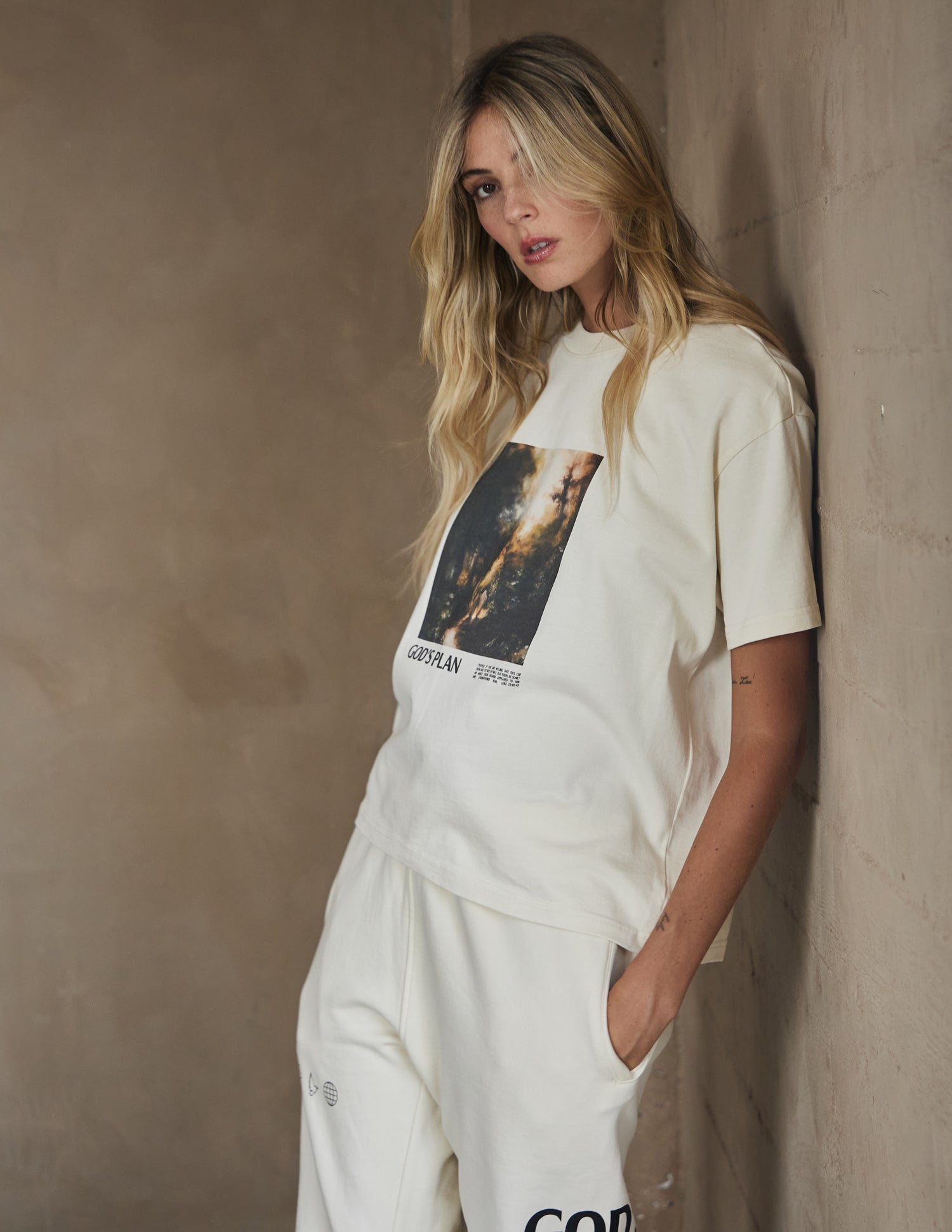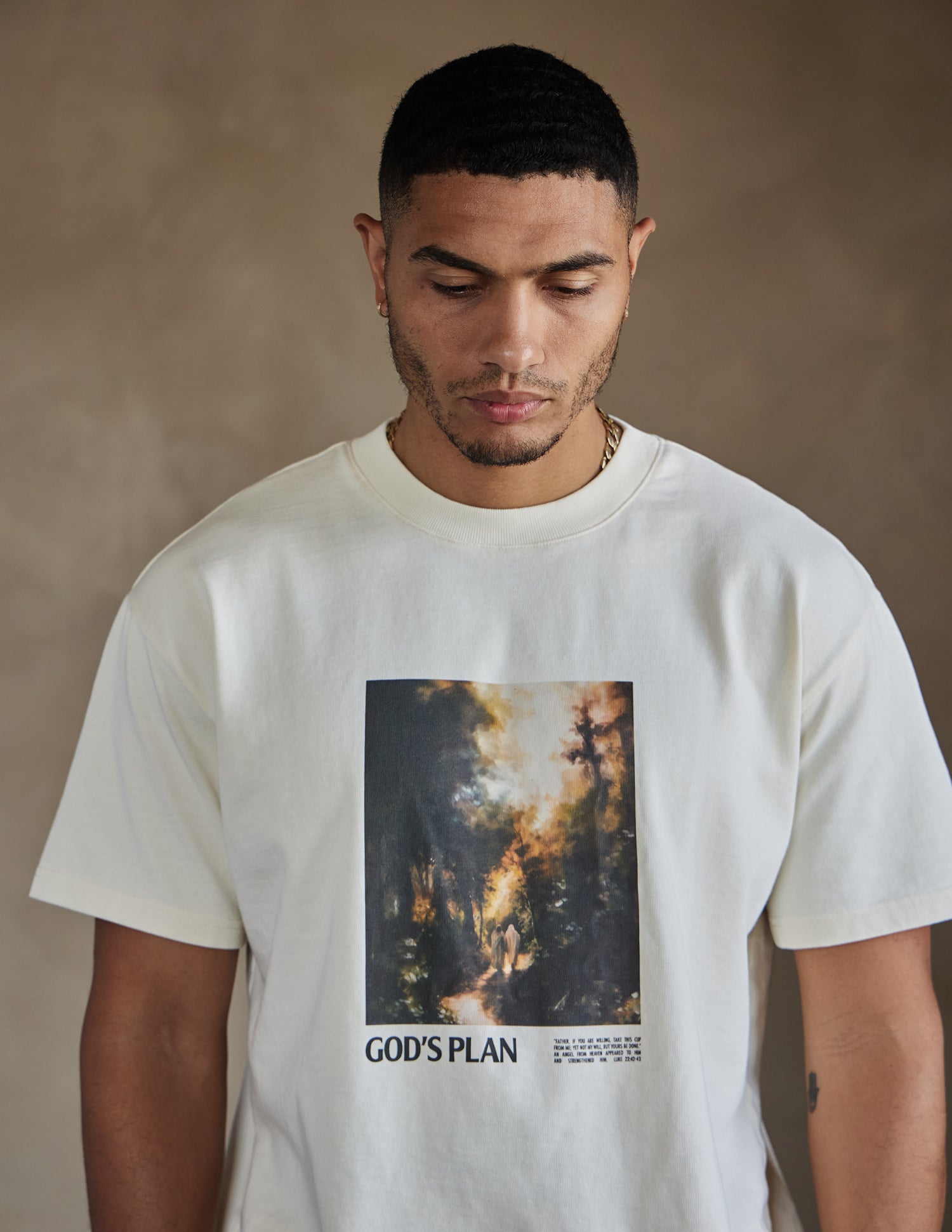 Our God's Plan Heavyweight Tee in alabaster. 100% premium combed cotton. 350gsm. God's Plan front print. An everyday essential.