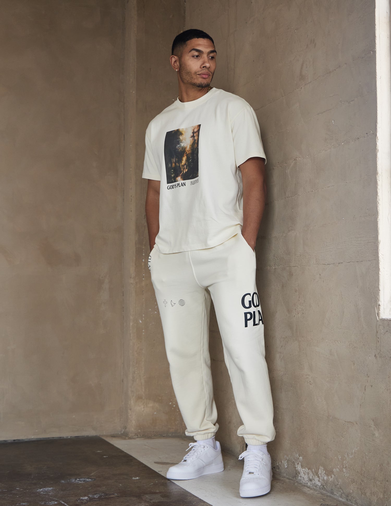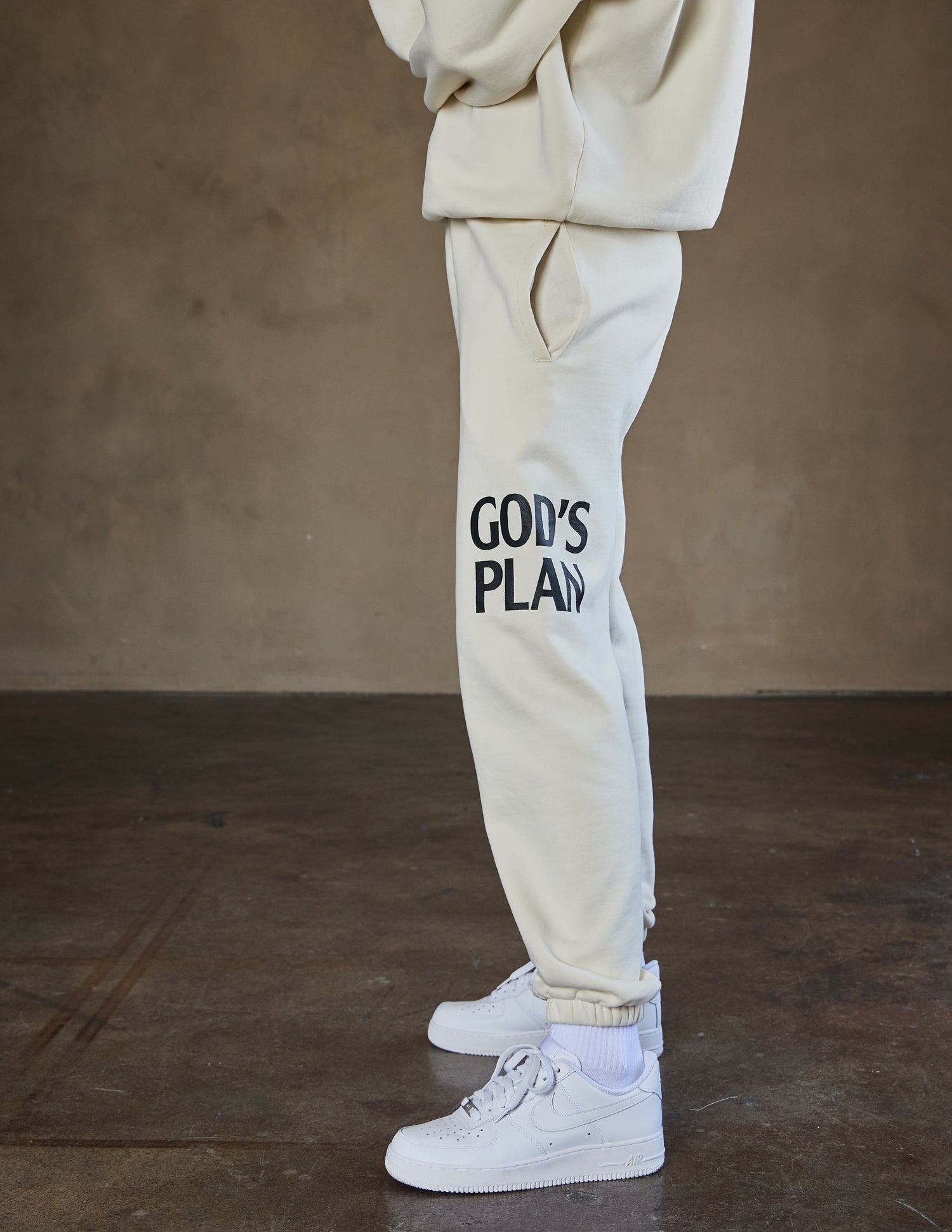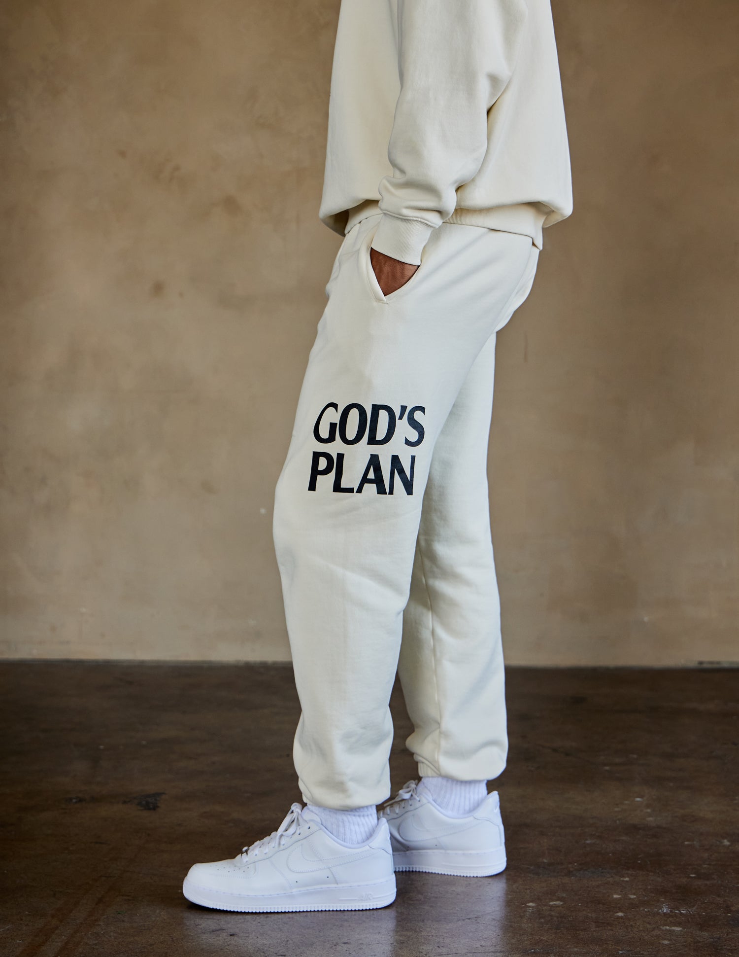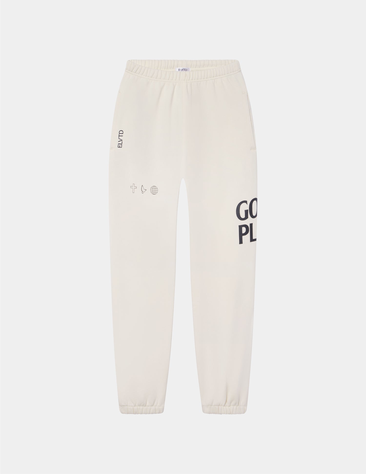 Our God's Plan Sweatpant in alabaster. 100% premium combed cotton. 450gsm. God's Plan print on left leg. ELVTD logo embroidery on right pocket. Heaven symbols on right leg. Hidden drawcords.
