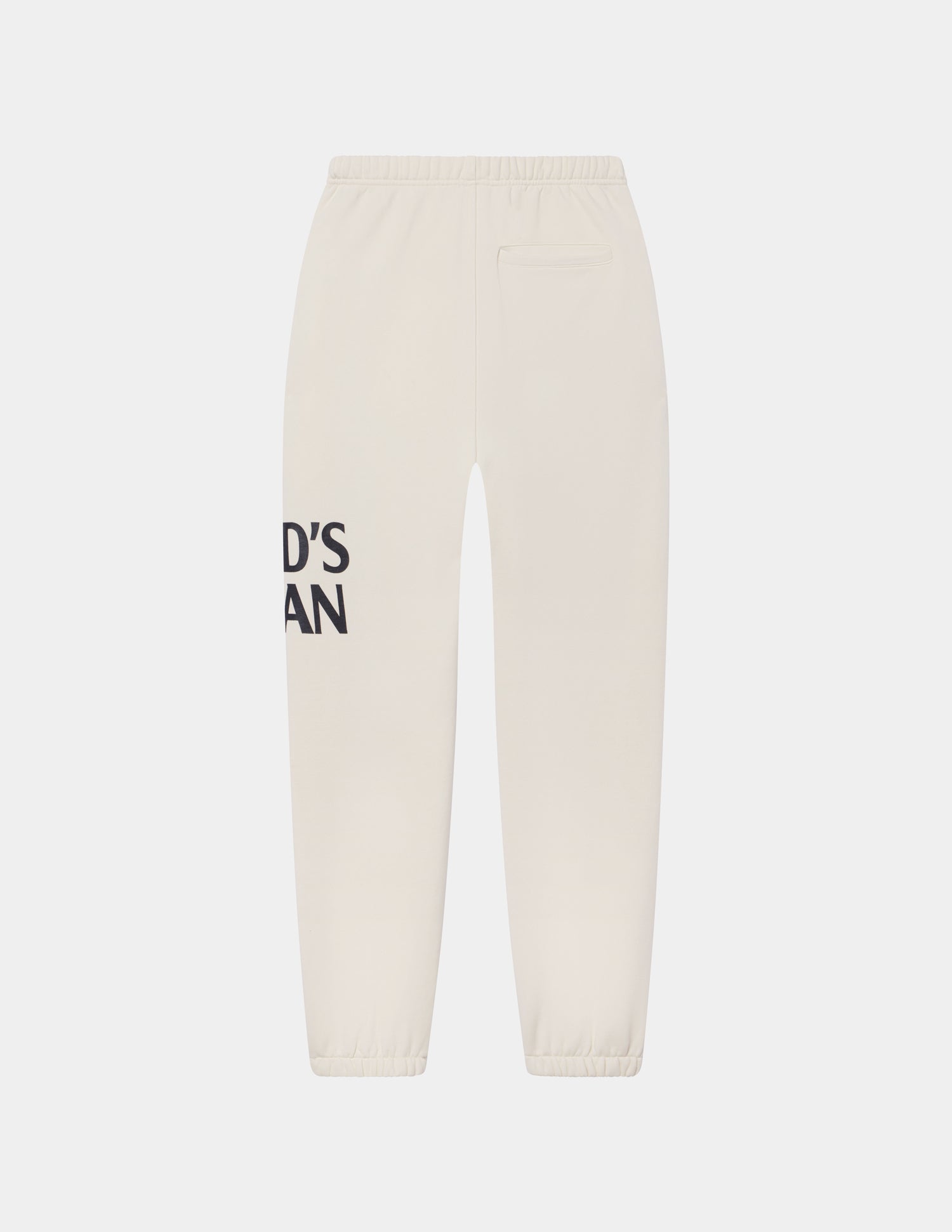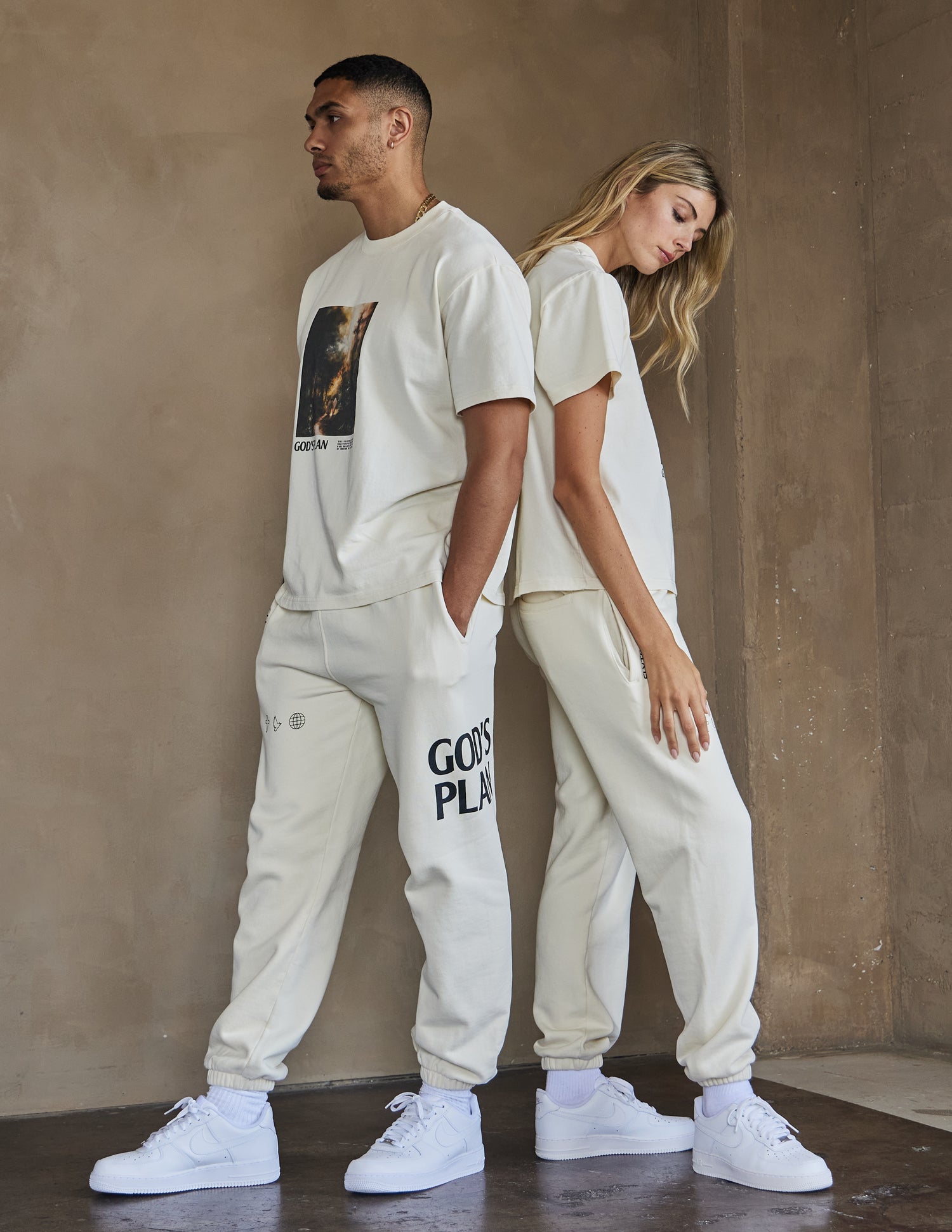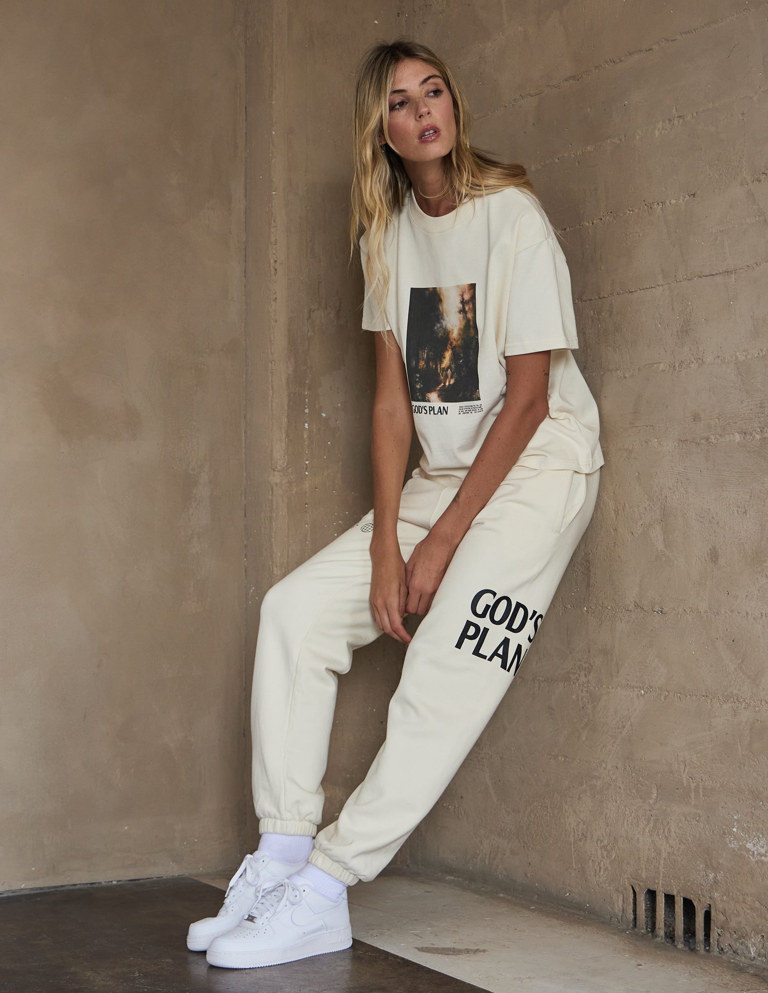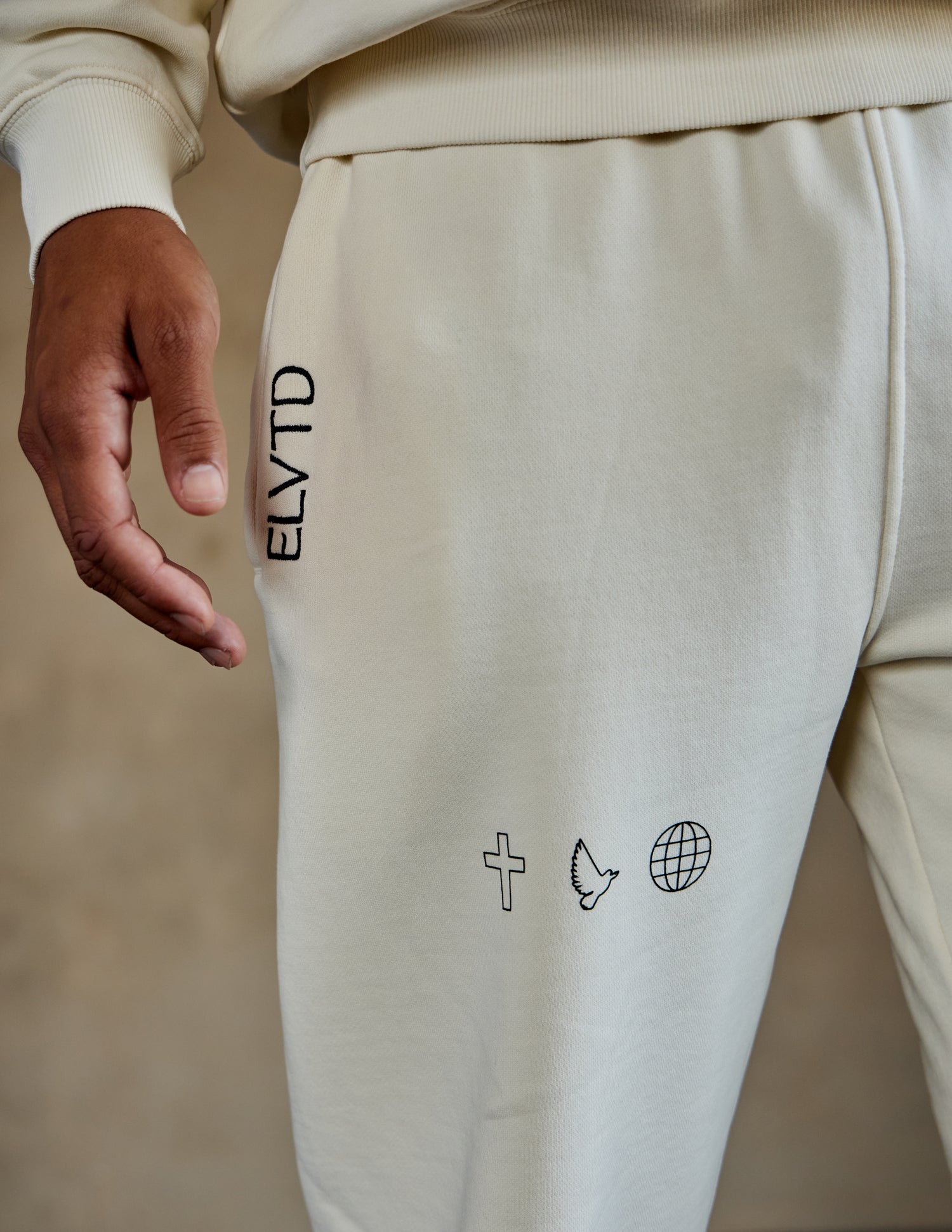 Our God's Plan Sweatpant in alabaster. 100% premium combed cotton. 450gsm. God's Plan print on left leg. ELVTD logo embroidery on right pocket. Heaven symbols on right leg. Hidden drawcords.