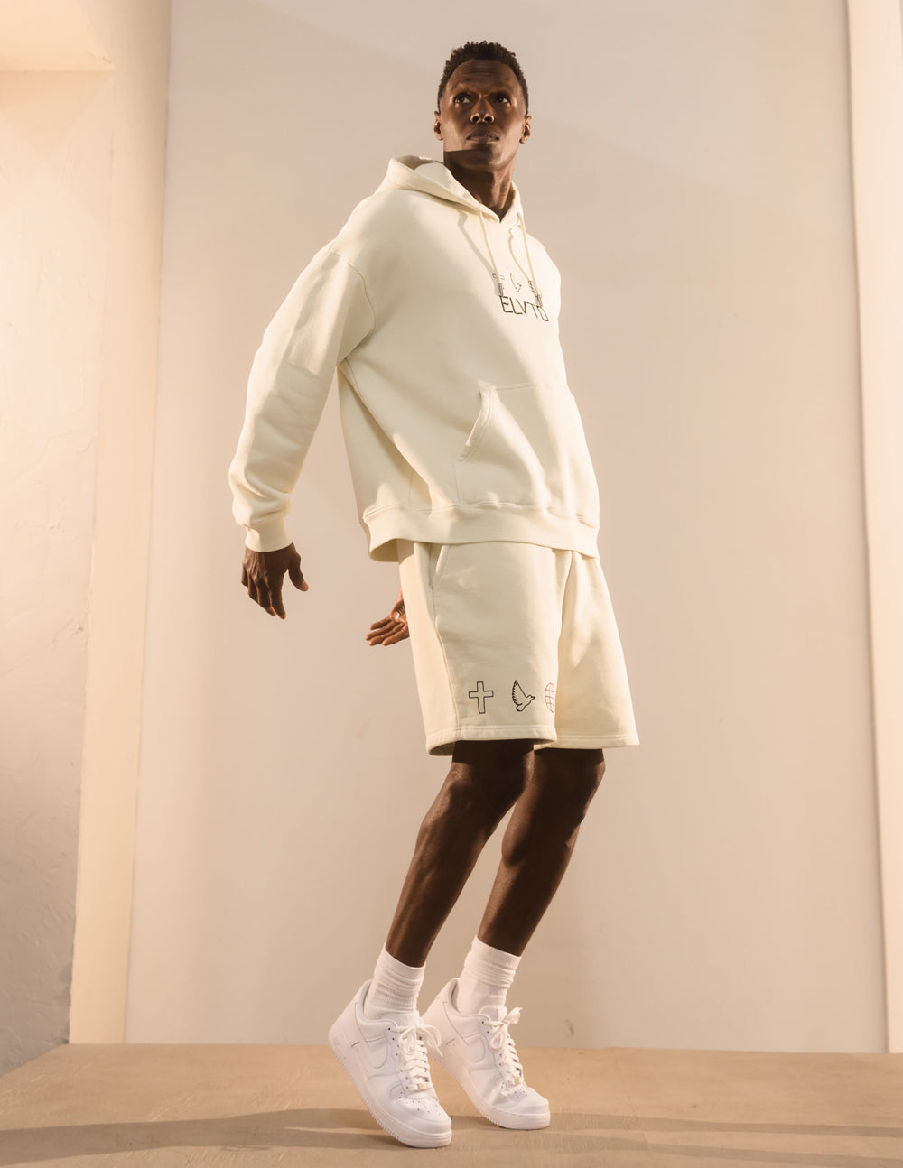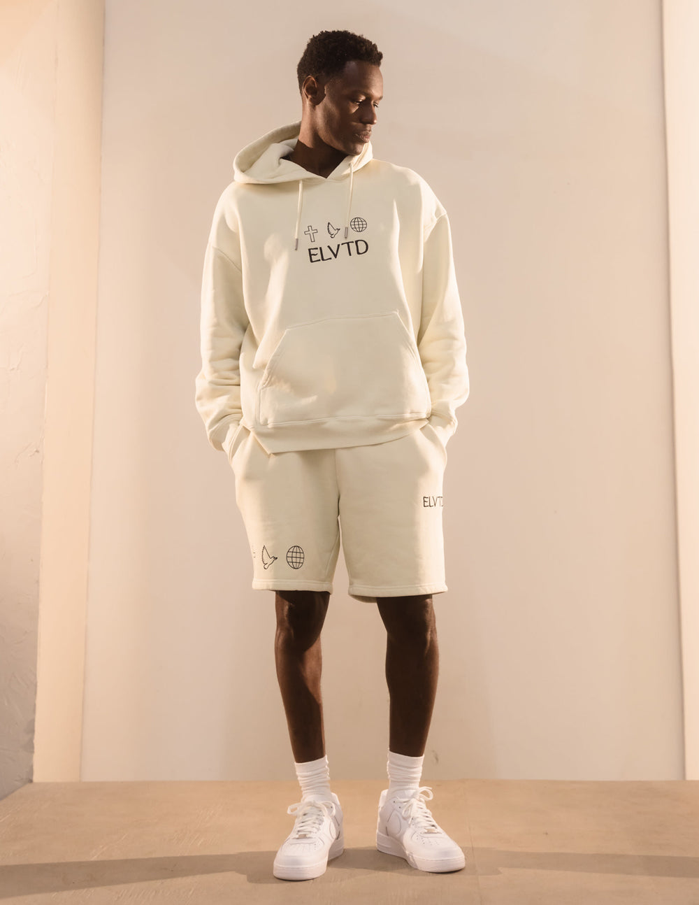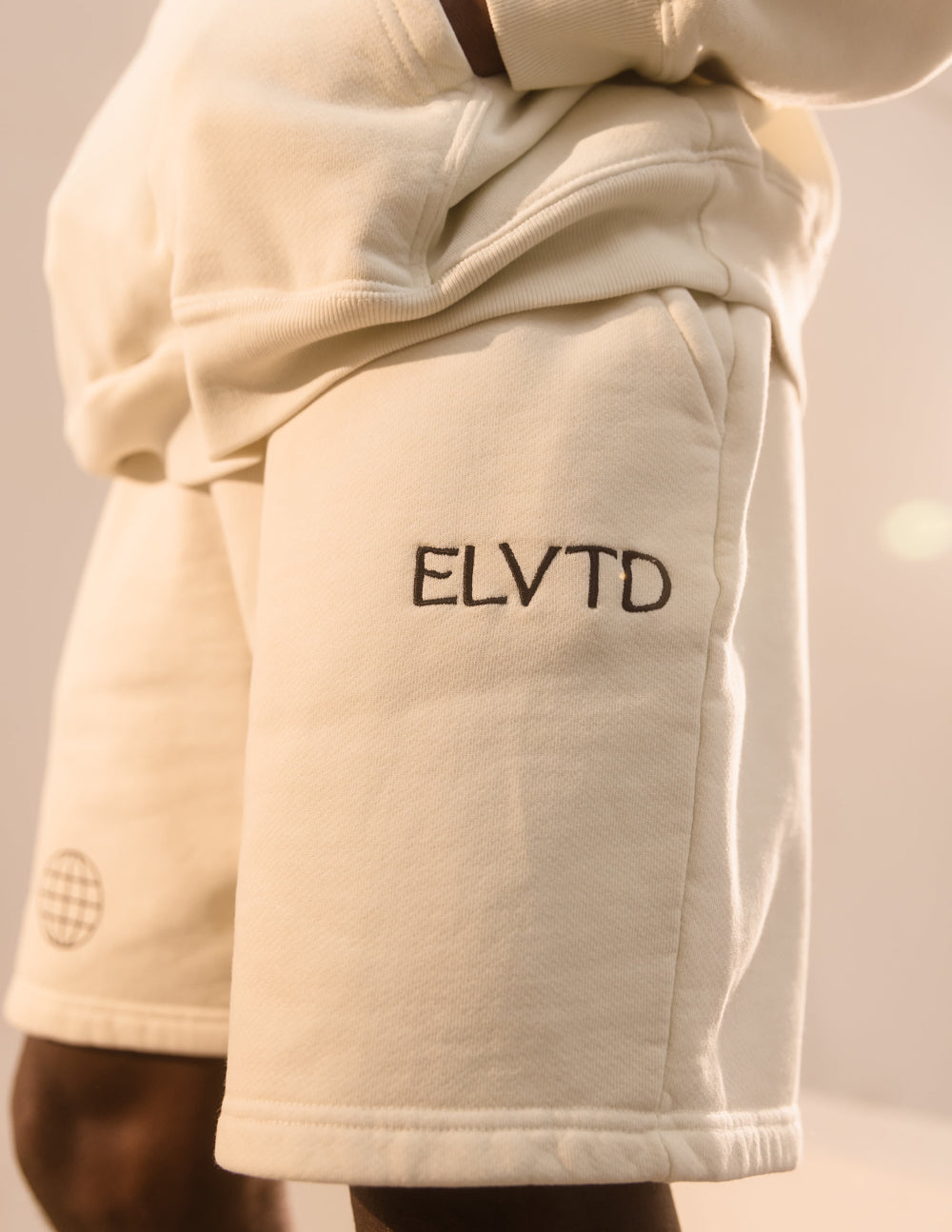 Our Core Short in cream. 100% premium combed cotton. 450gsm. Heaven symbols leg print and ELVTD logo embroidery. Hidden drawcords.