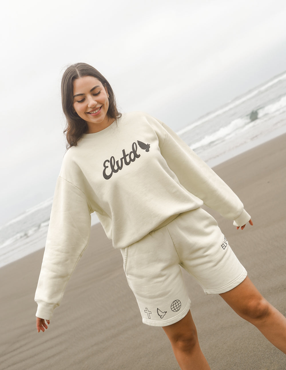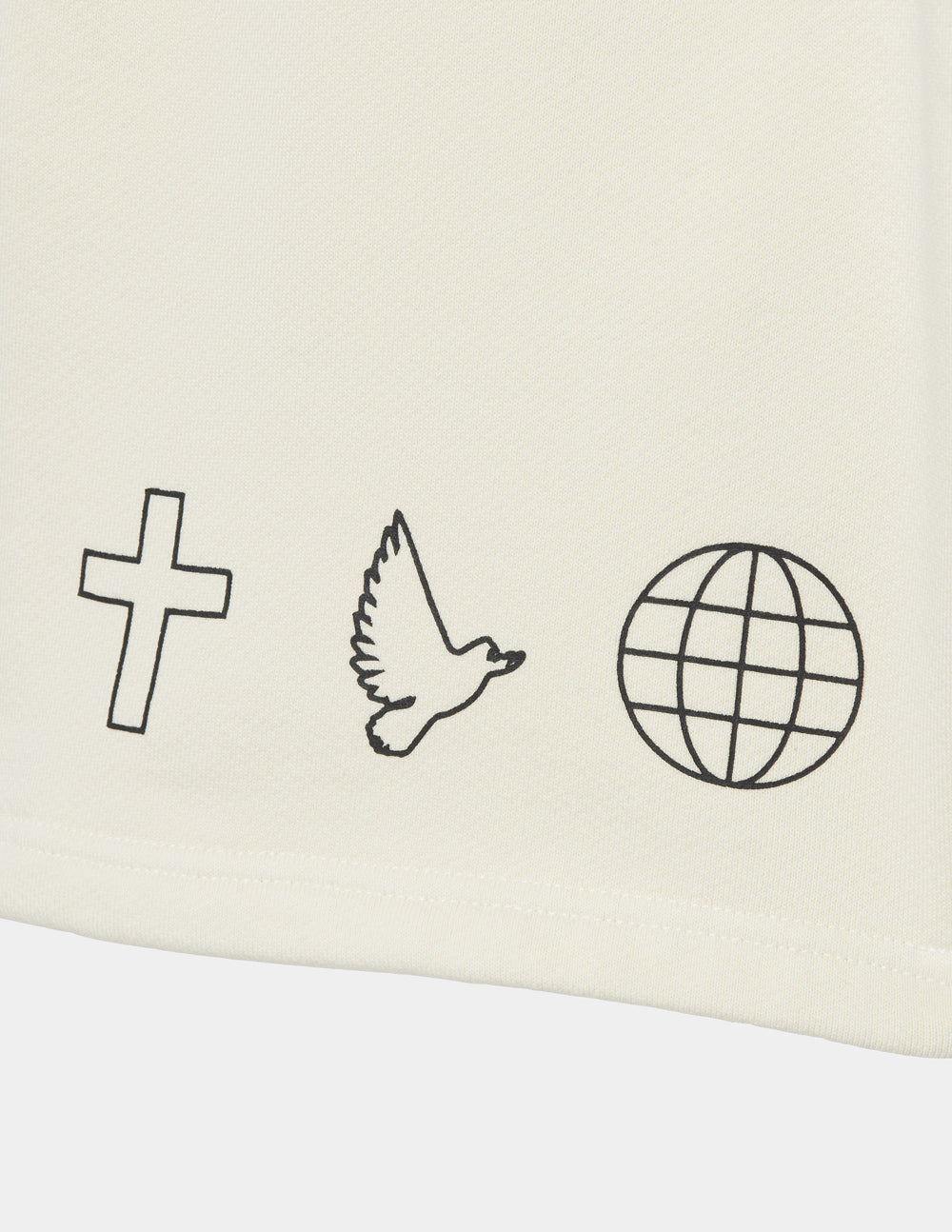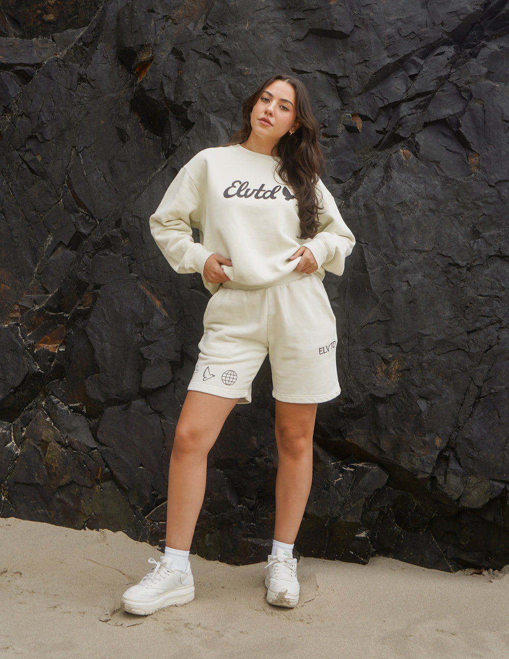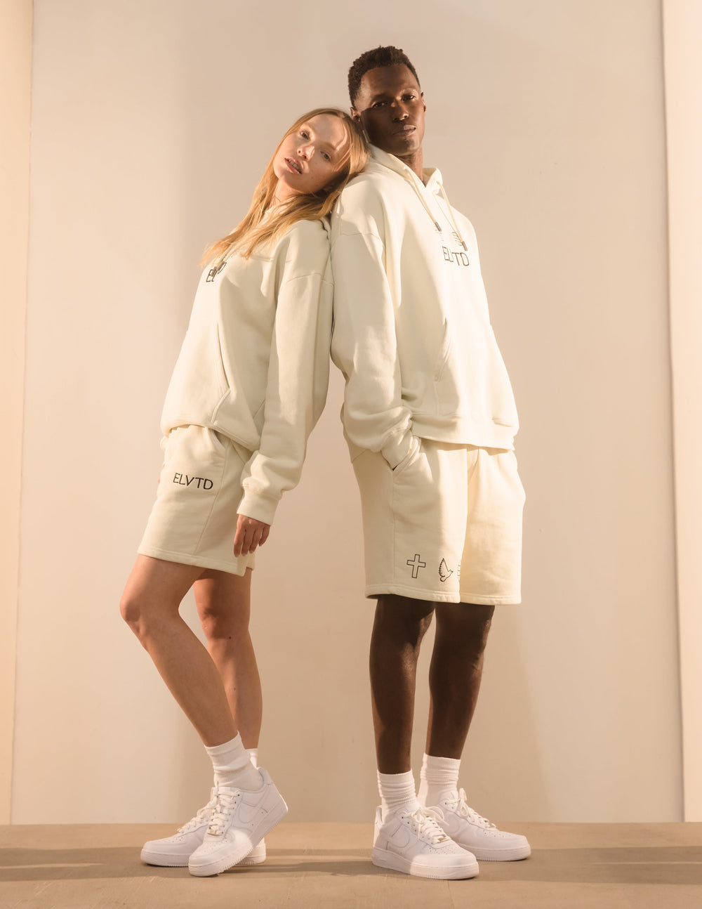 Our Core Short in cream. 100% premium combed cotton. 450gsm. Heaven symbols leg print and ELVTD logo embroidery. Hidden drawcords.