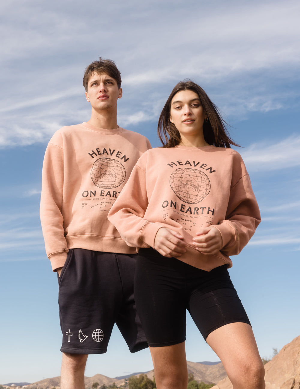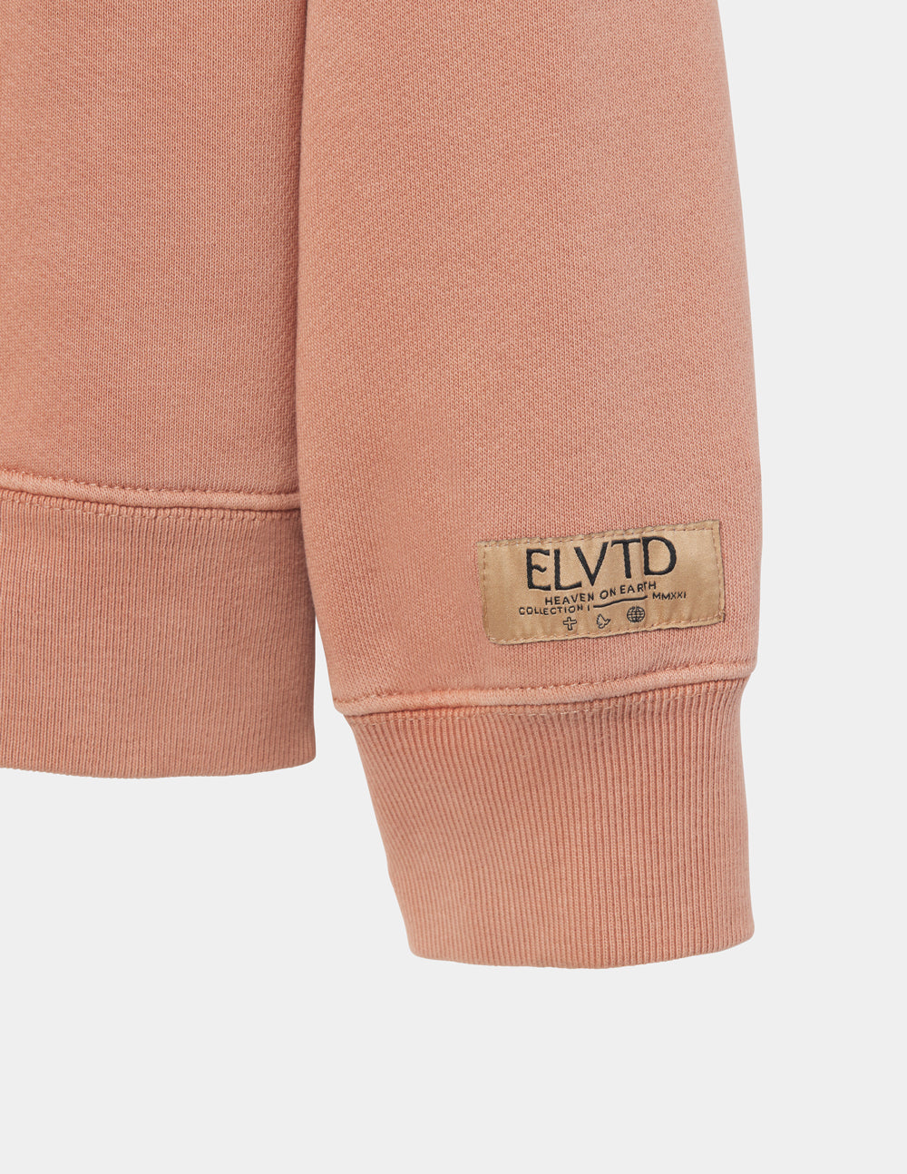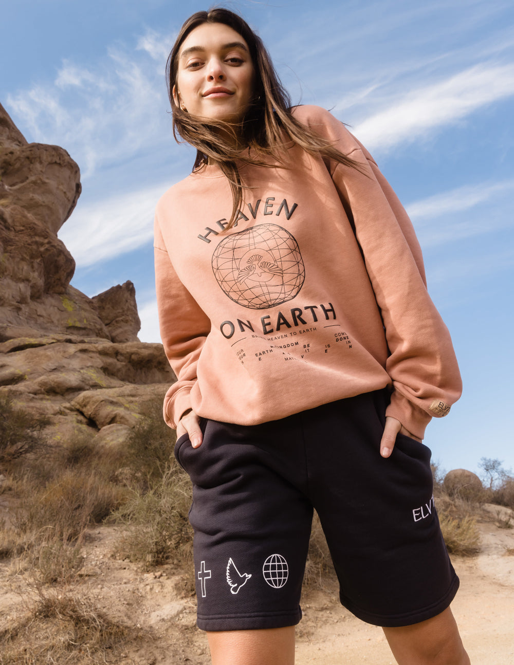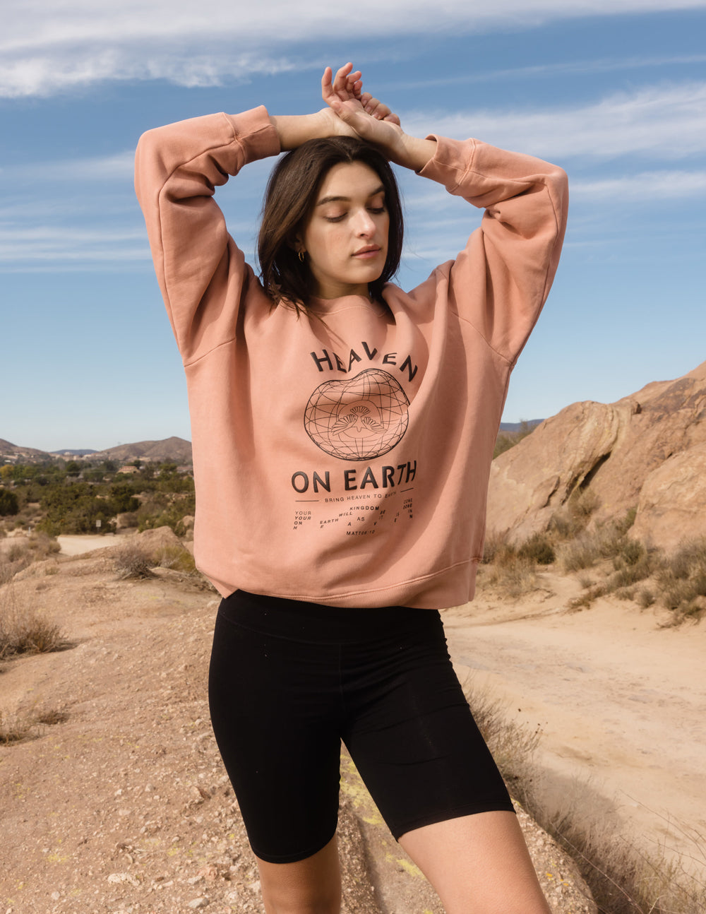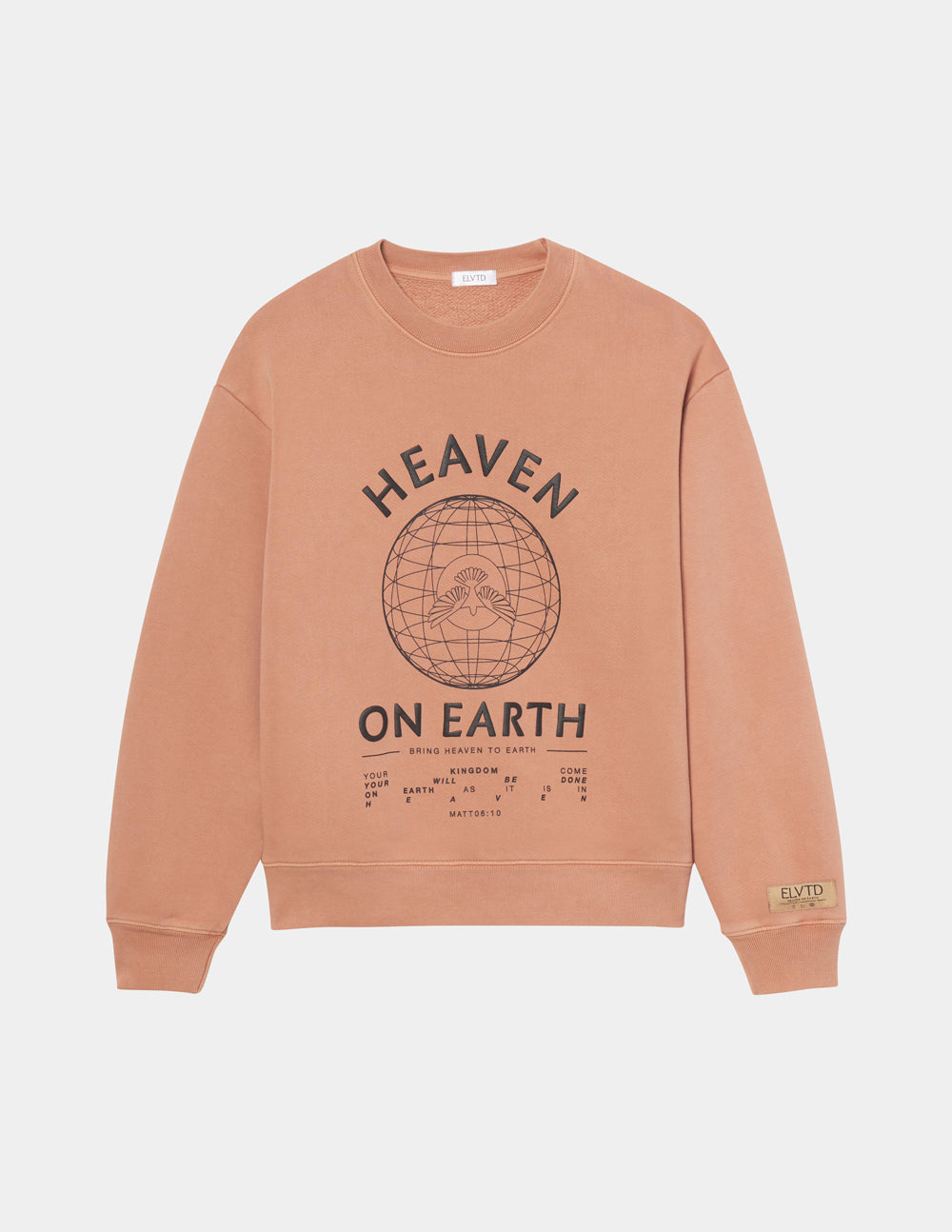 Our Heaven on Earth Crewneck in beige pink. 100% premium combed cotton. 450gsm. Heaven on Earth front puff print. ELVTD logo patch on sleeve.