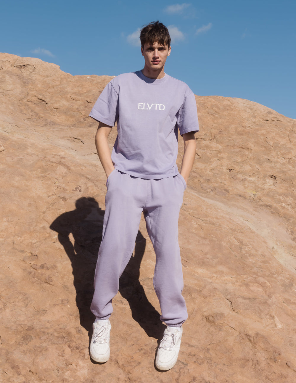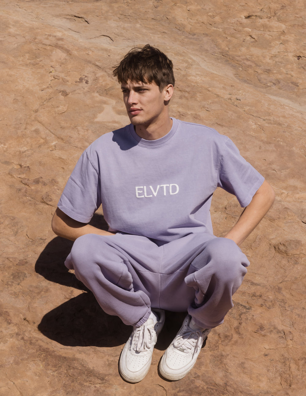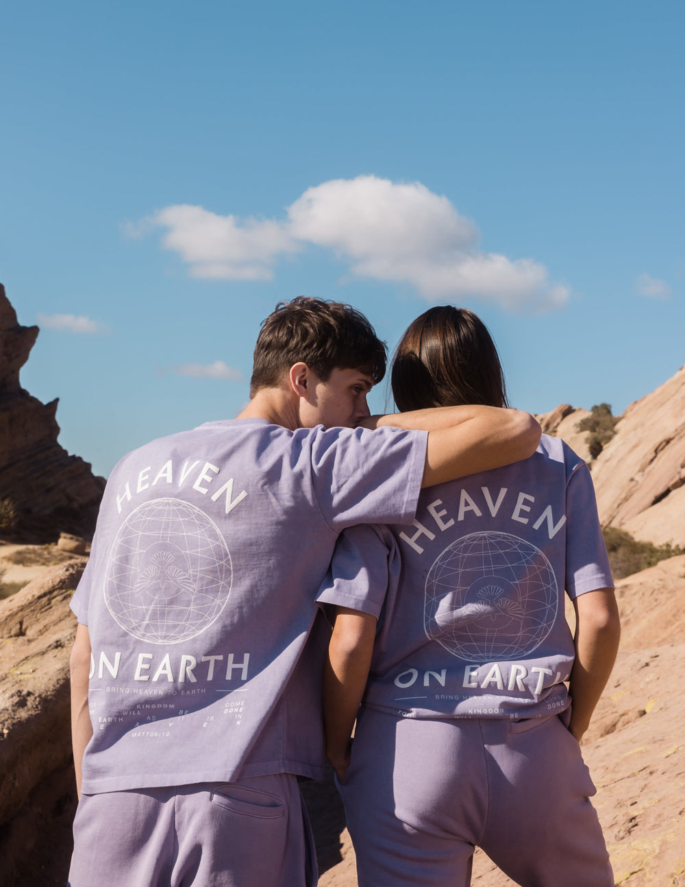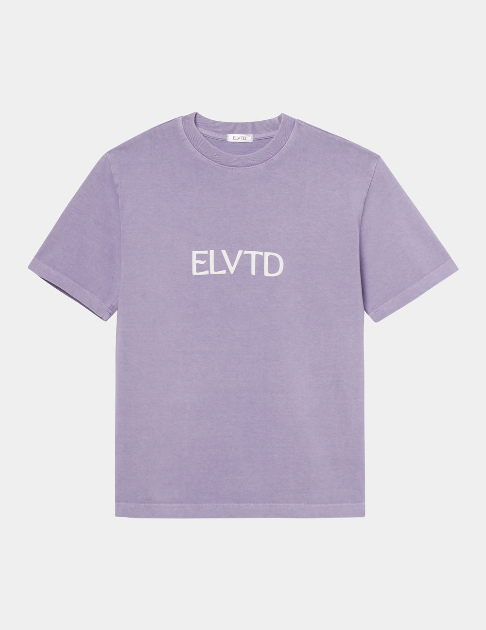 Our Heaven on Earth Heavyweight Tee in amethyst. 100% premium combed cotton. 350gsm. ELVTD logo front puff print, Heaven on Earth back puff print. An everyday essential.