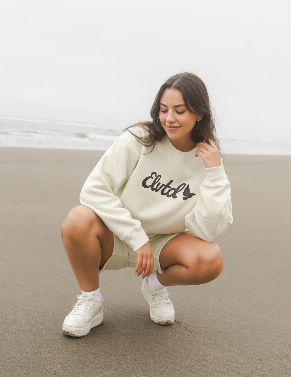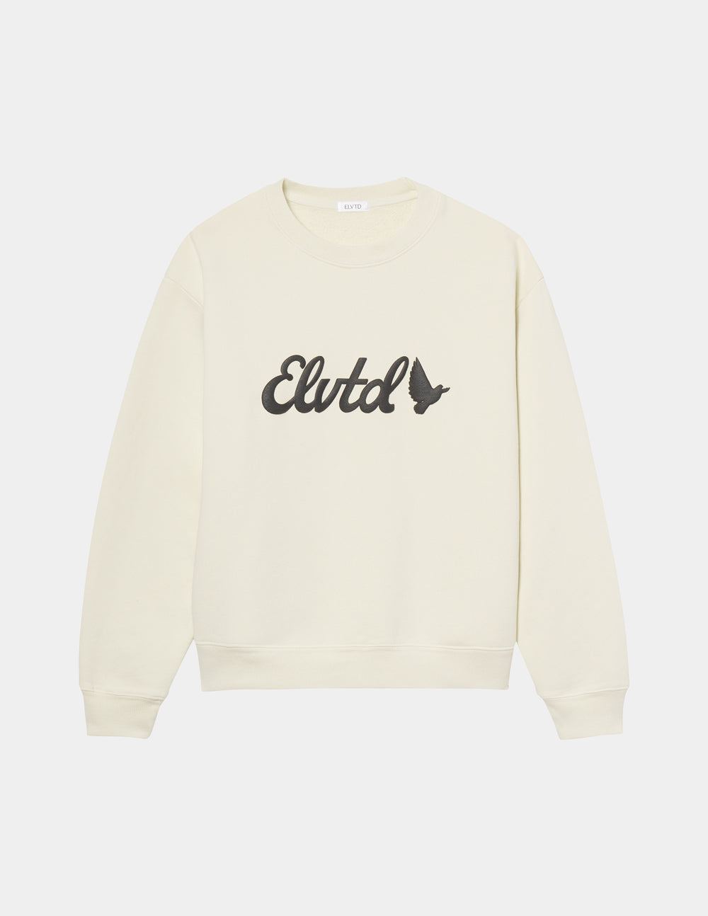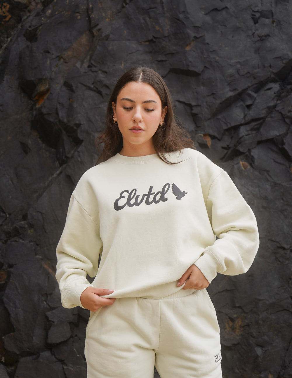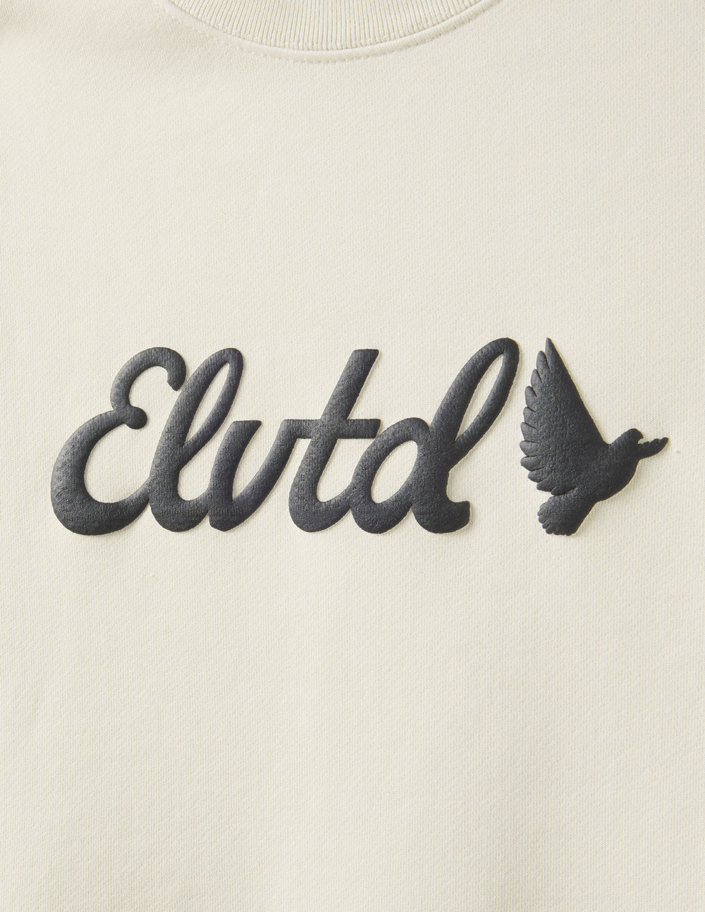 Our Cursive Logo Crewneck in cream. 100% premium combed cotton. 450gsm. Cursive ELVTD logo front puff print.