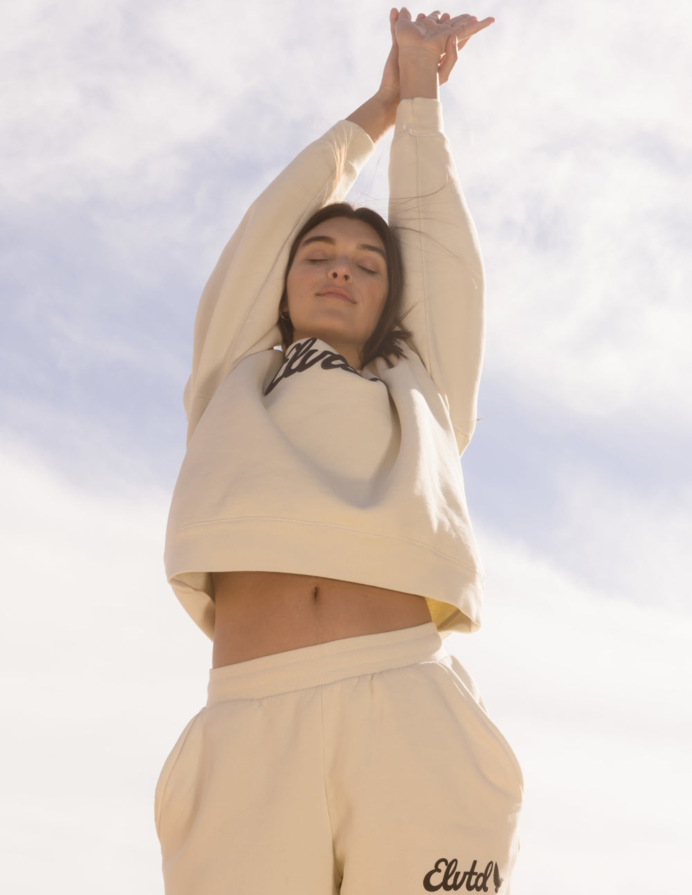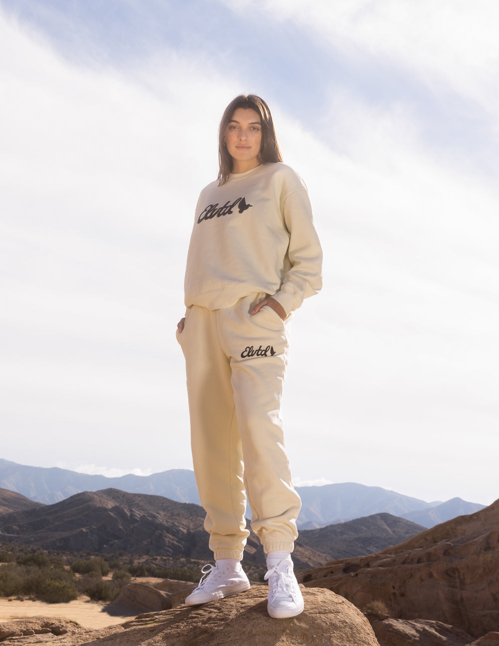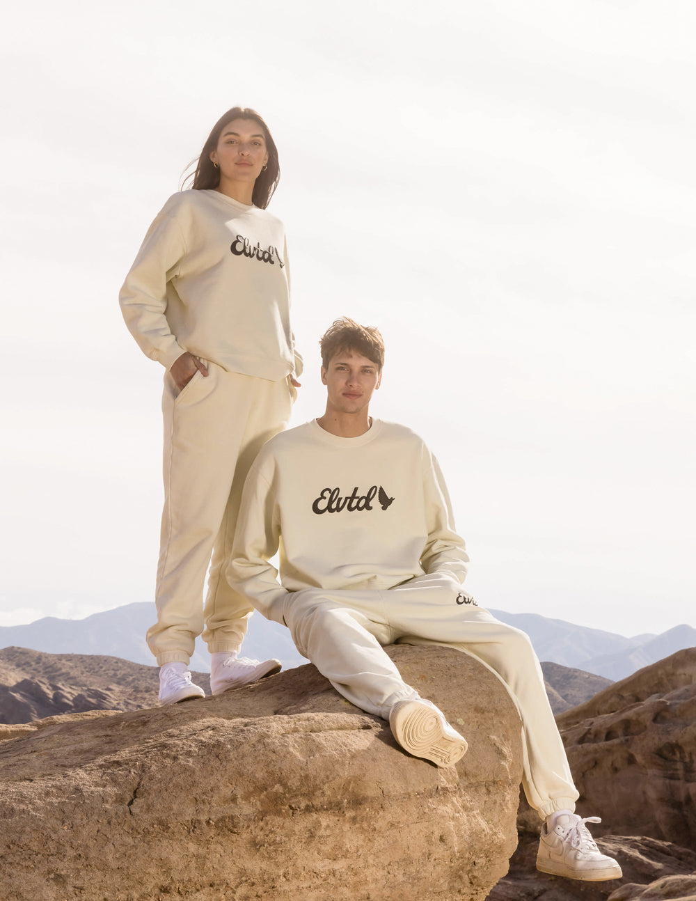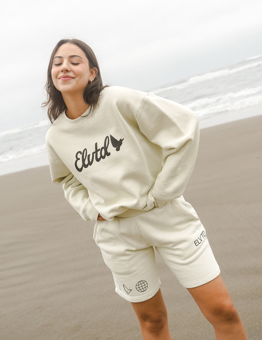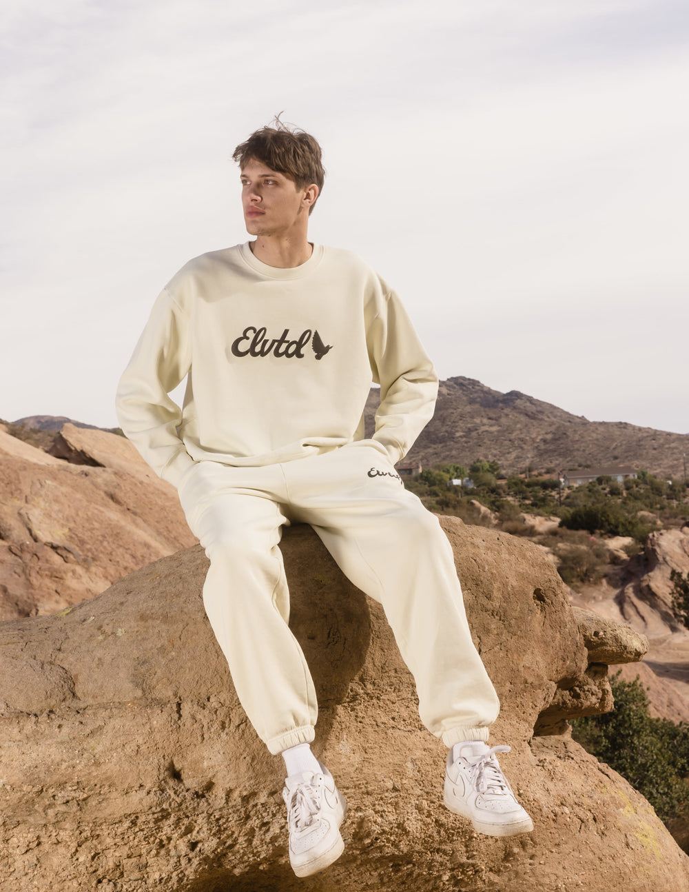 Our Cursive Logo Crewneck in cream. 100% premium combed cotton. 450gsm. Cursive ELVTD logo front puff print.