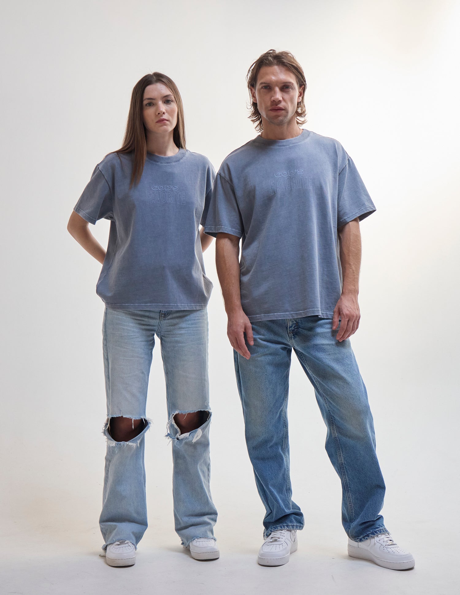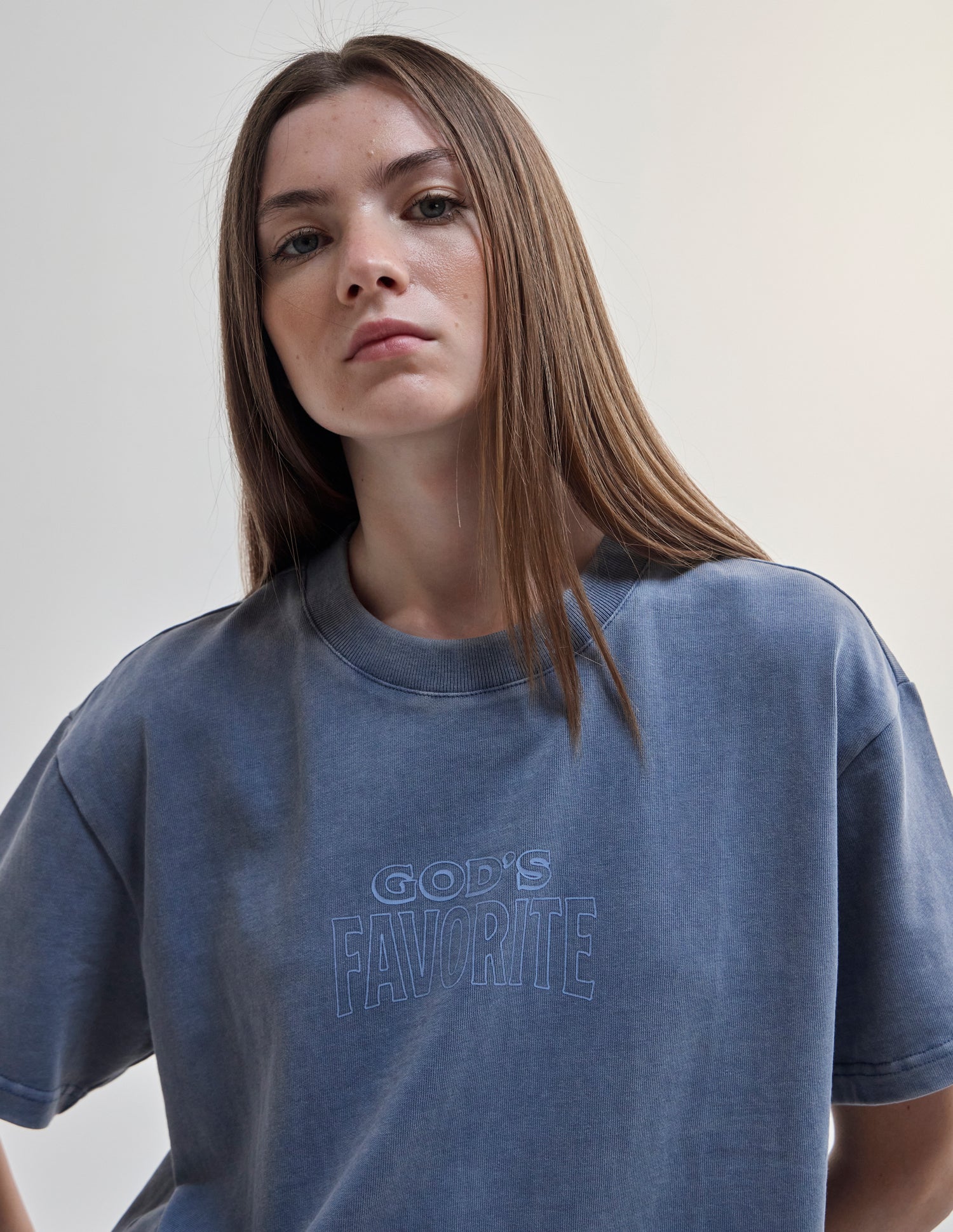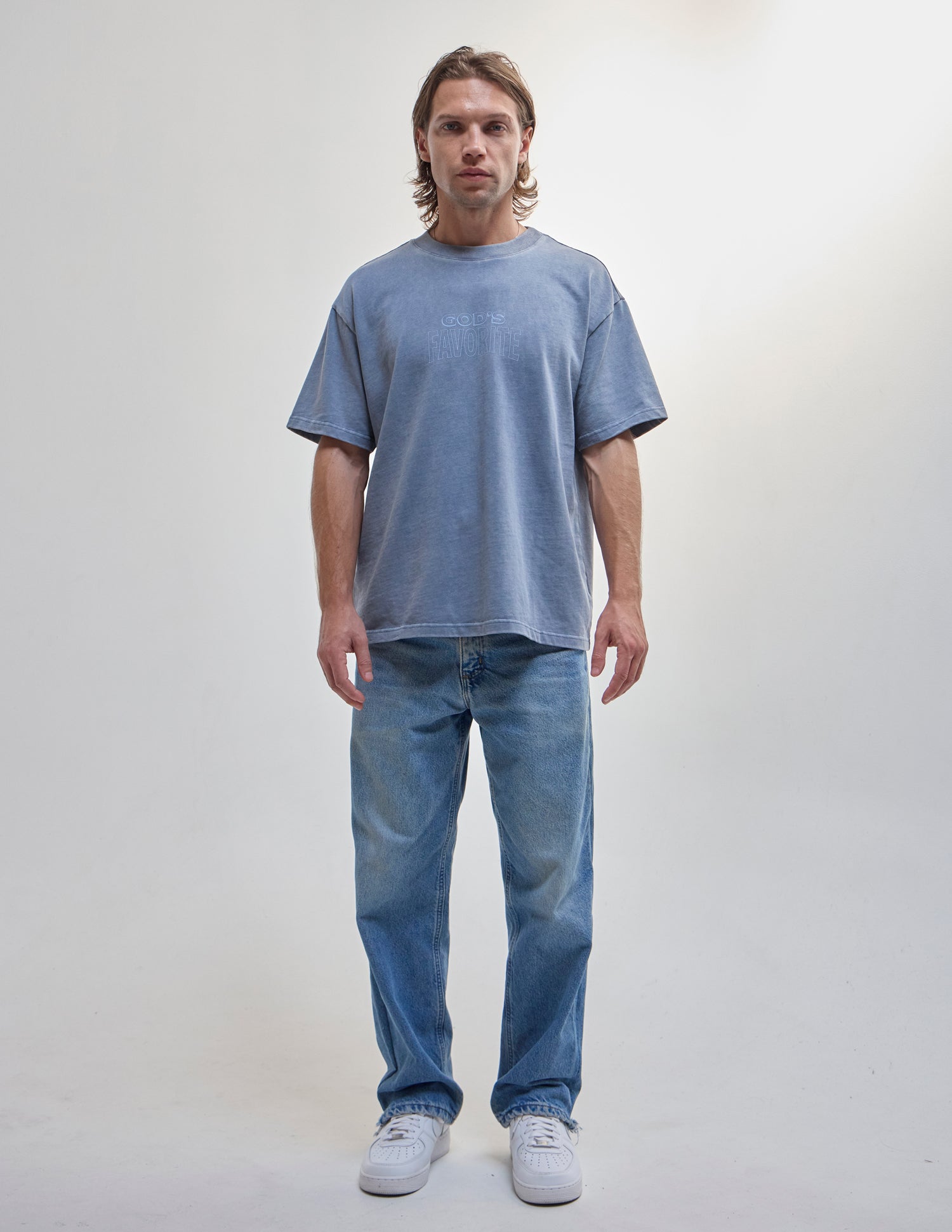Our God's Favorite Heavyweight Tee in deep fjord. 100% premium combed cotton. 350gsm. God's Favorite front and back print.