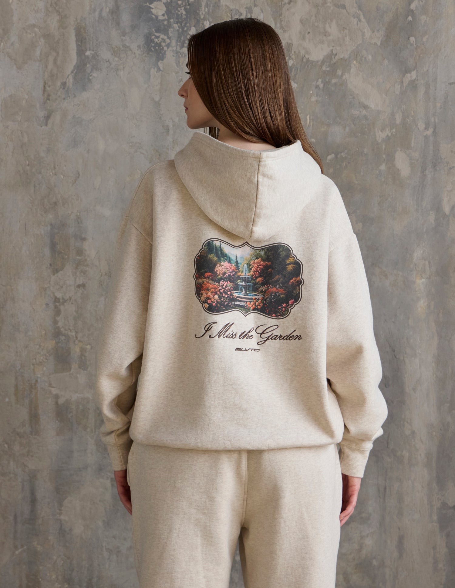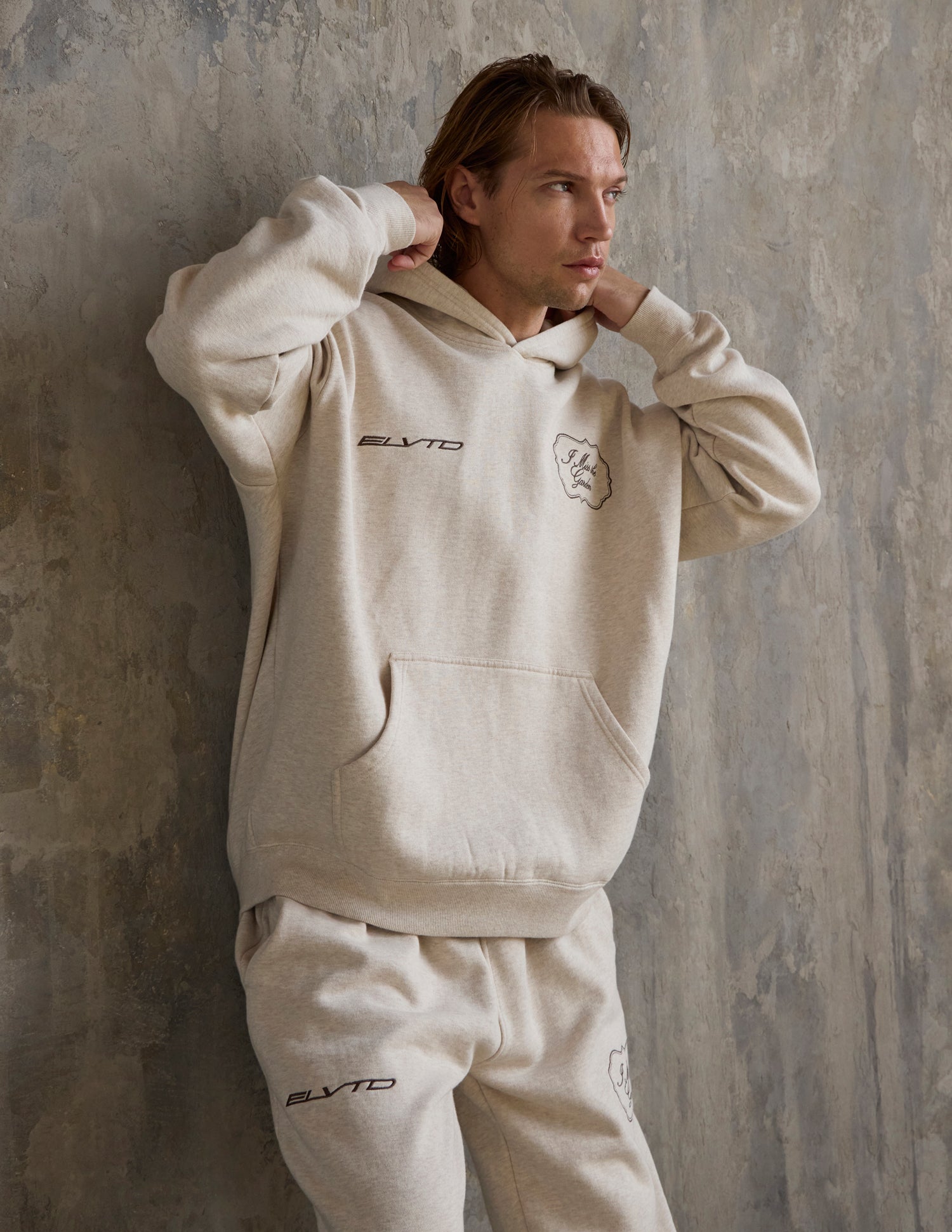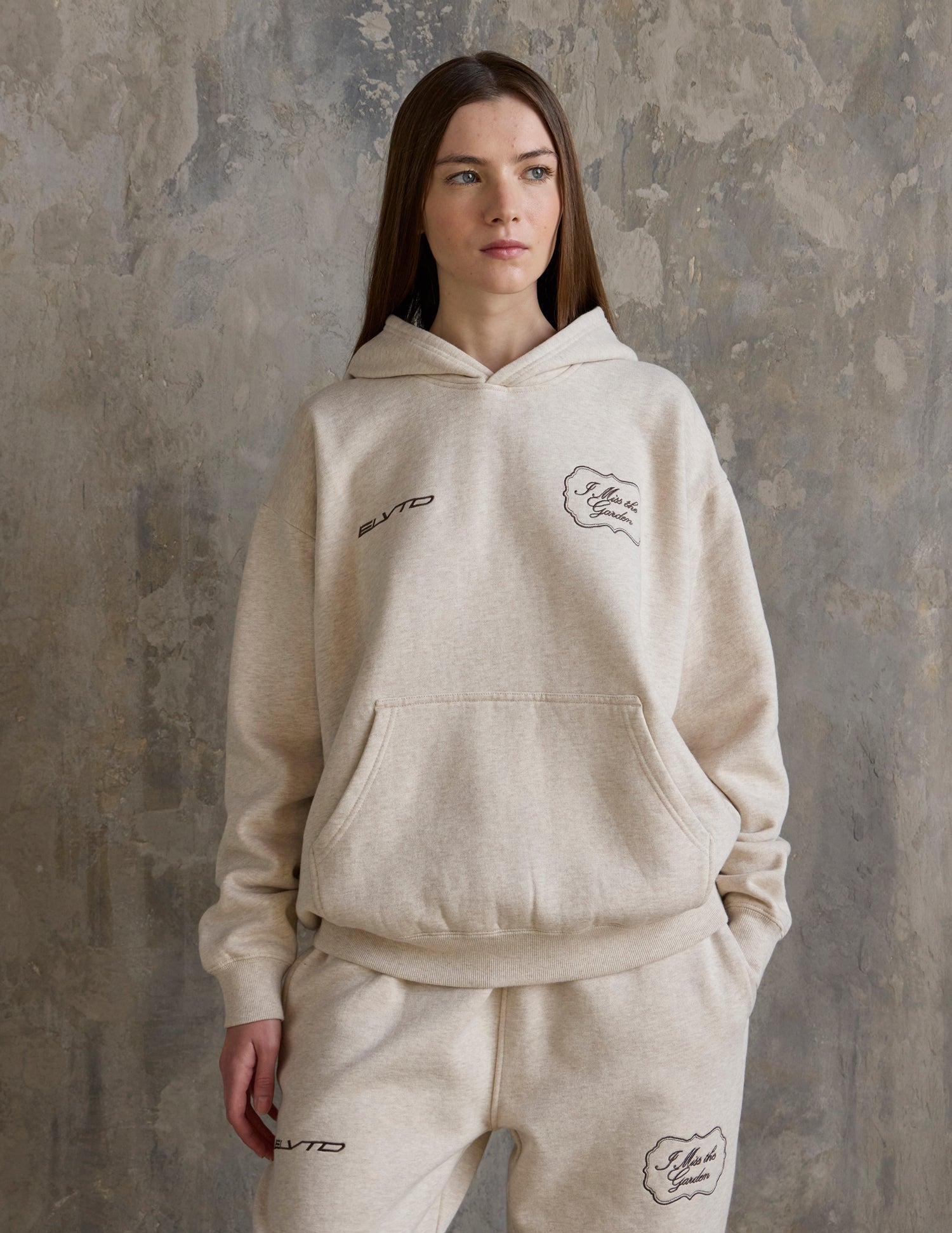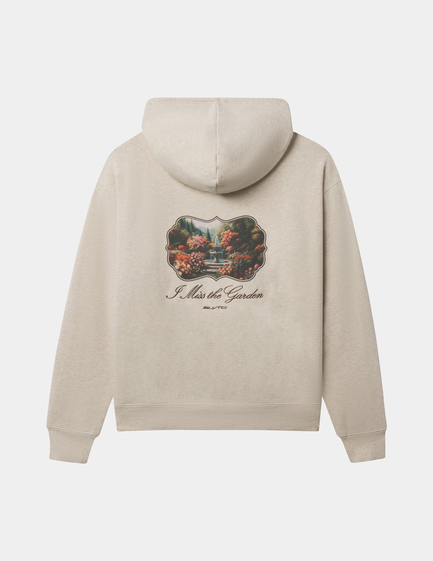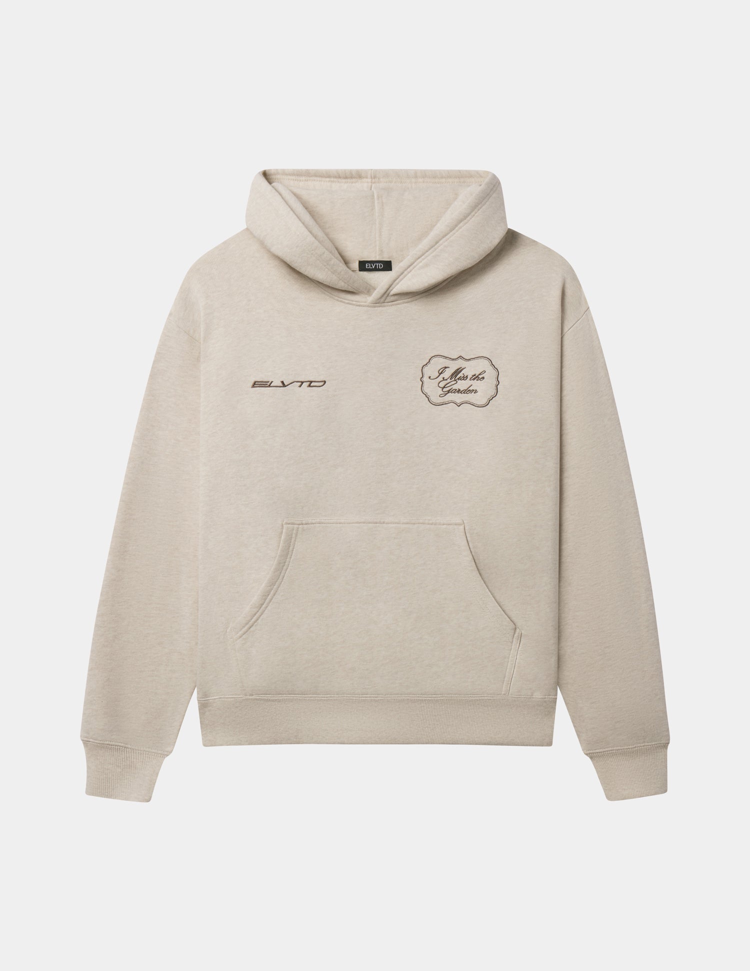 Our I Miss the Garden Hoodie in heather sand. 100% premium combed cotton. 420gsm. ELVTD and I Miss the Garden front embroidery. I Miss the Garden and ELVTD back embroidery and print.