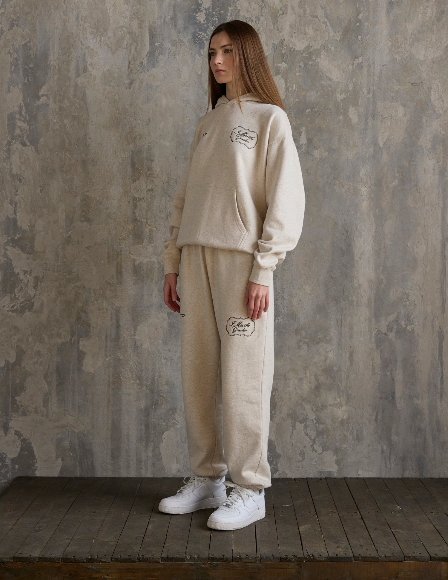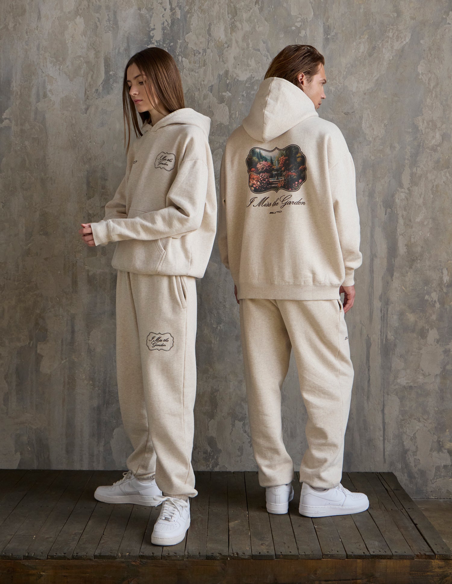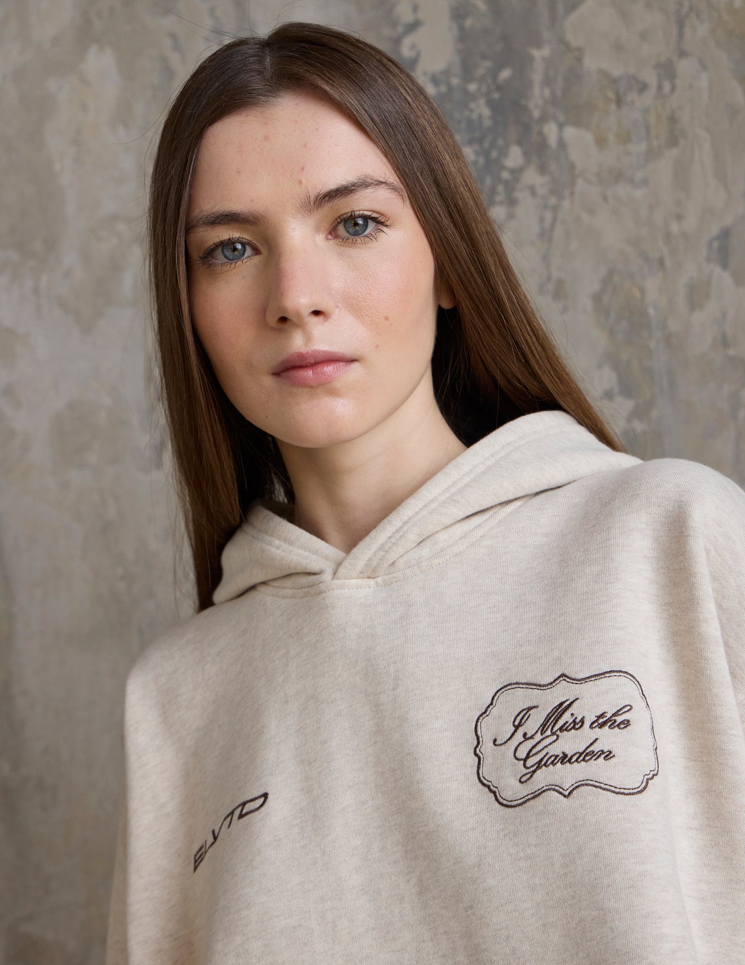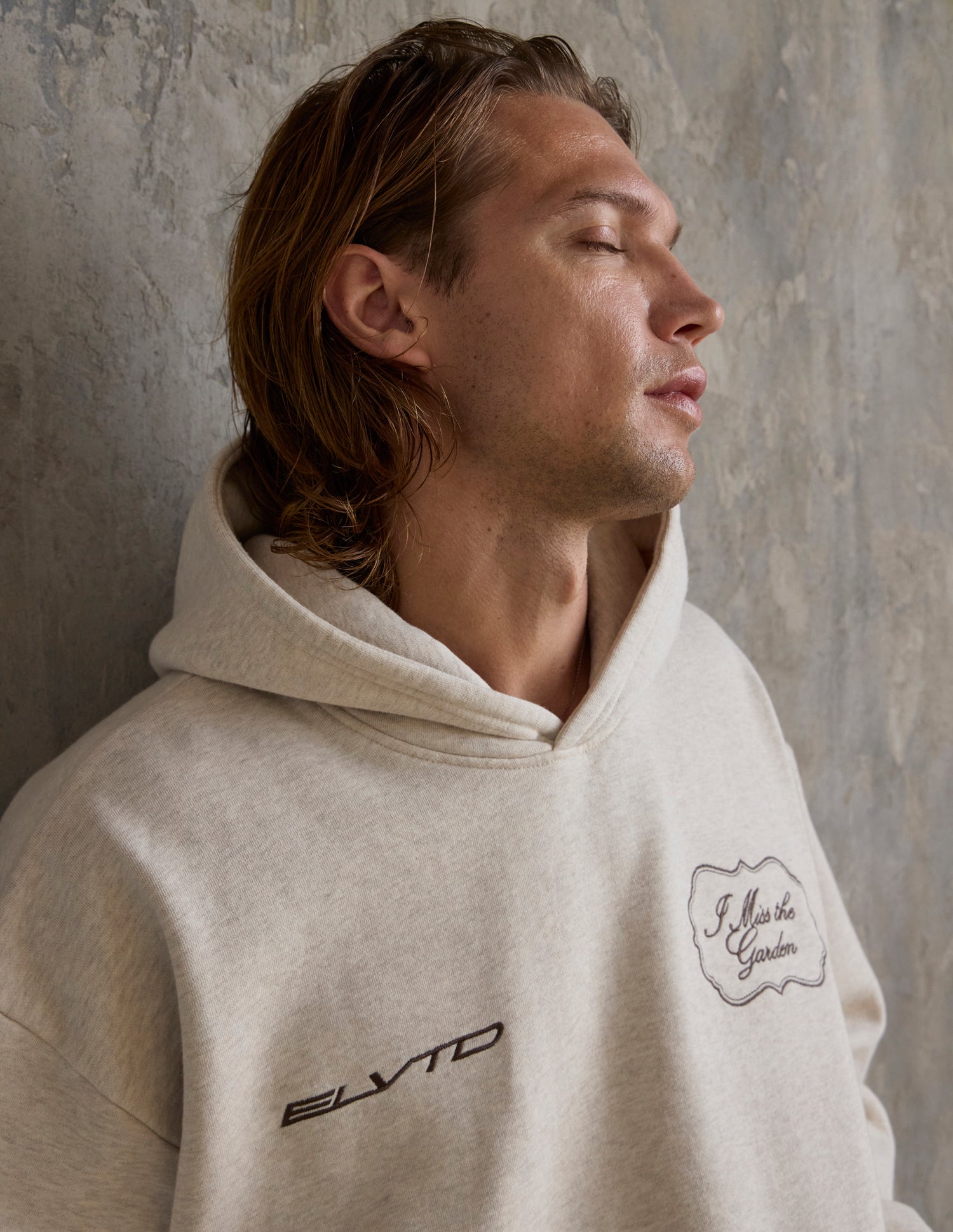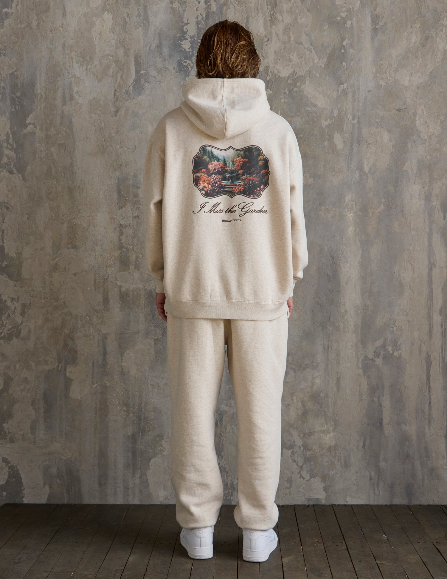 Our I Miss the Garden Hoodie in heather sand. 100% premium combed cotton. 420gsm. ELVTD and I Miss the Garden front embroidery. I Miss the Garden and ELVTD back embroidery and print.