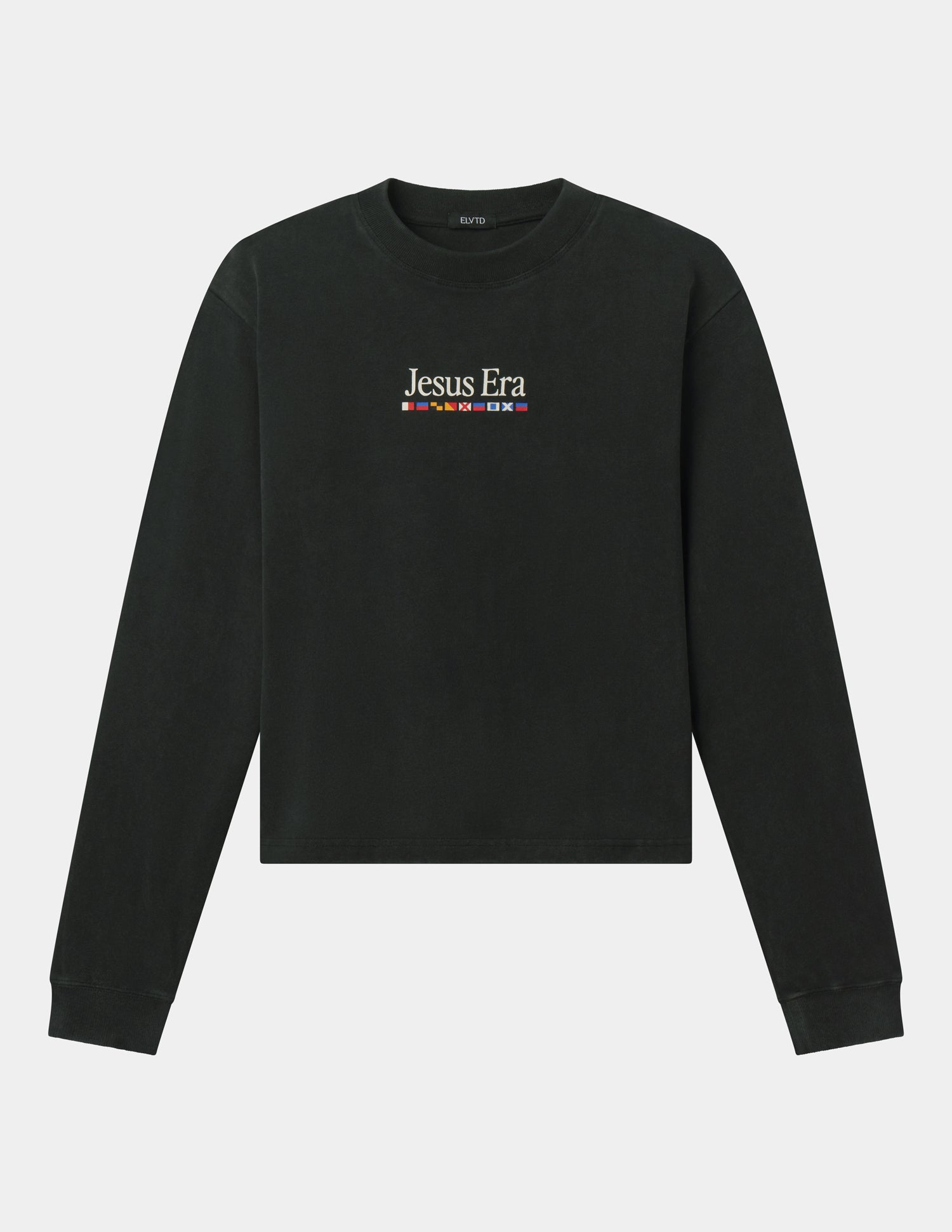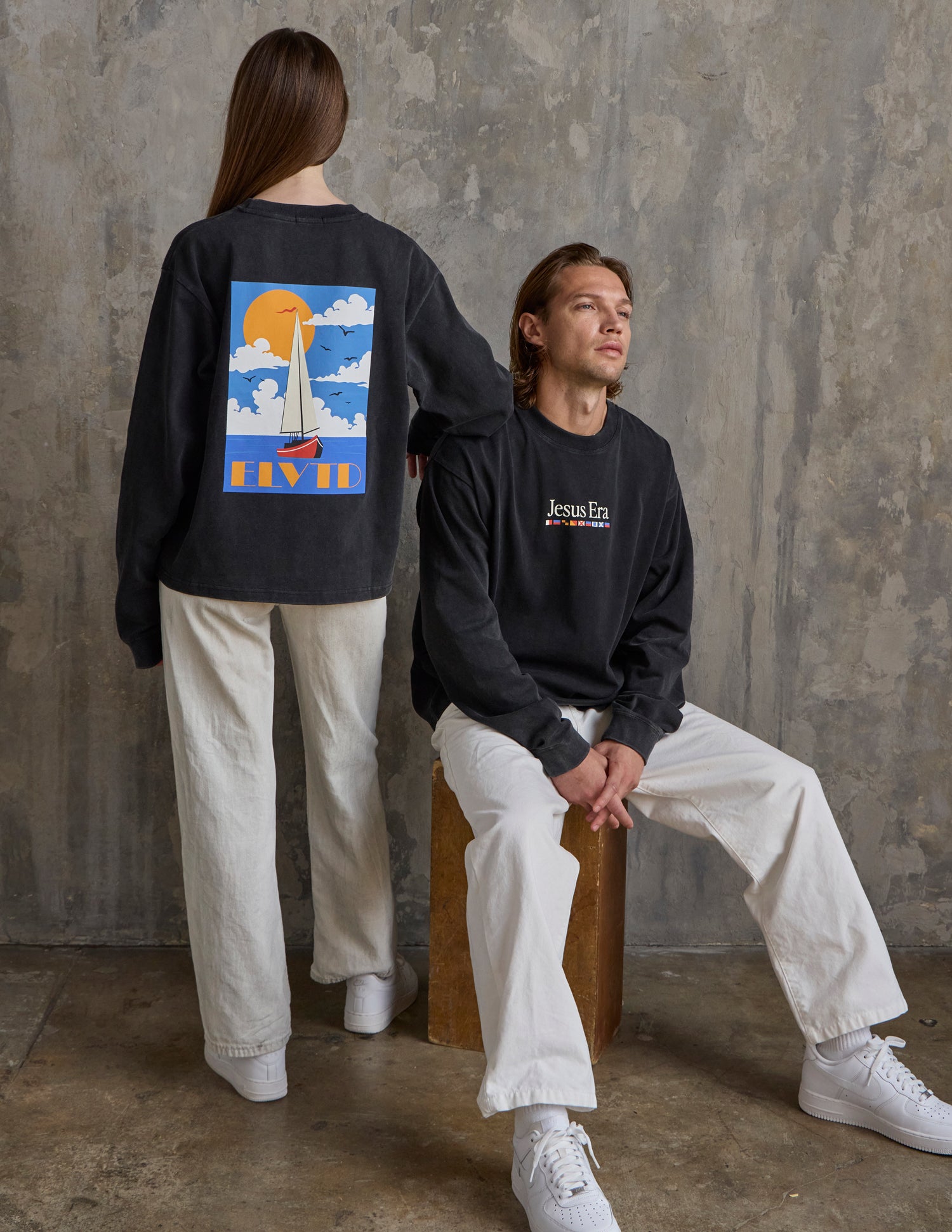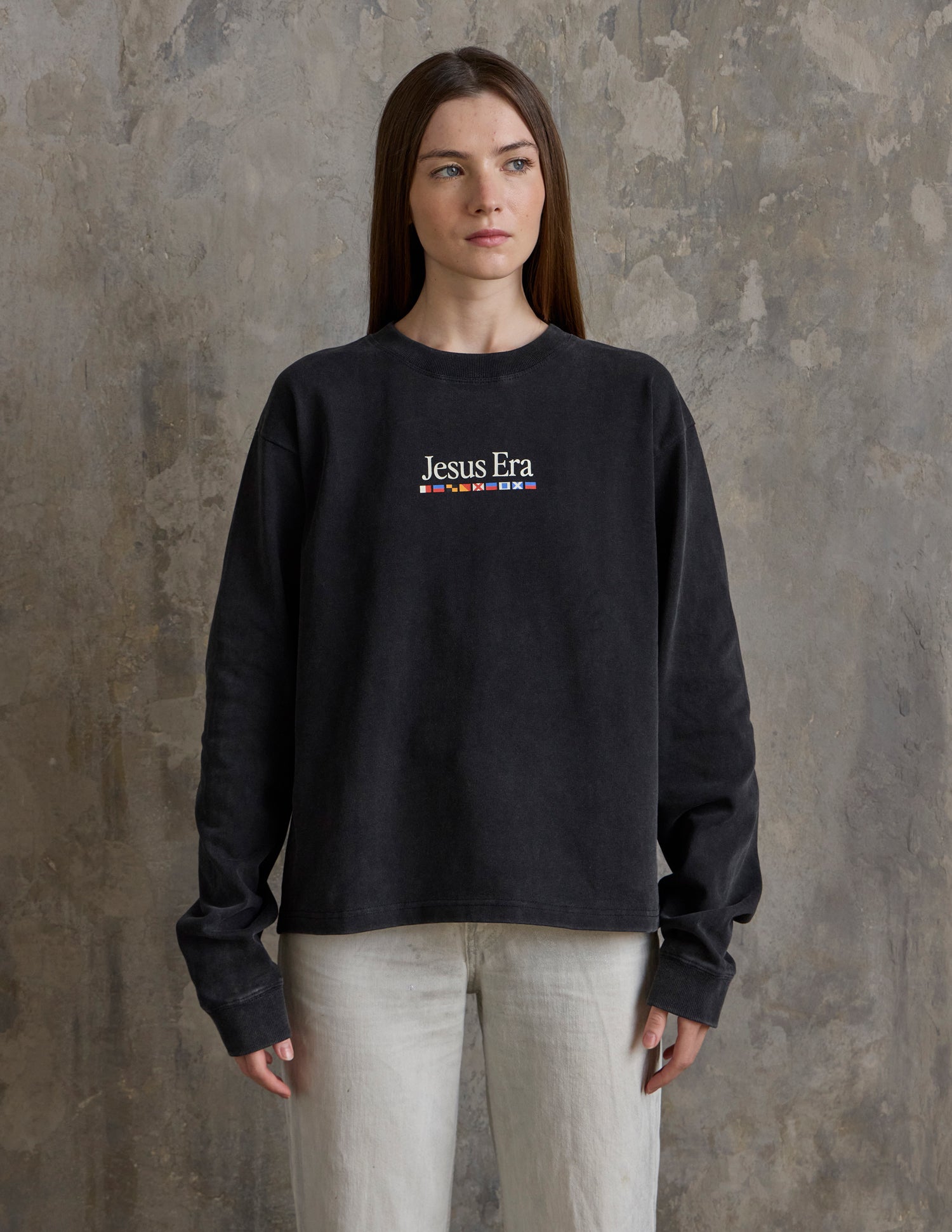 Our Jesus Era Long Sleeve Heavyweight Tee in nightfall. 100% premium combed cotton. 350gsm. Jesus Era front and back print.