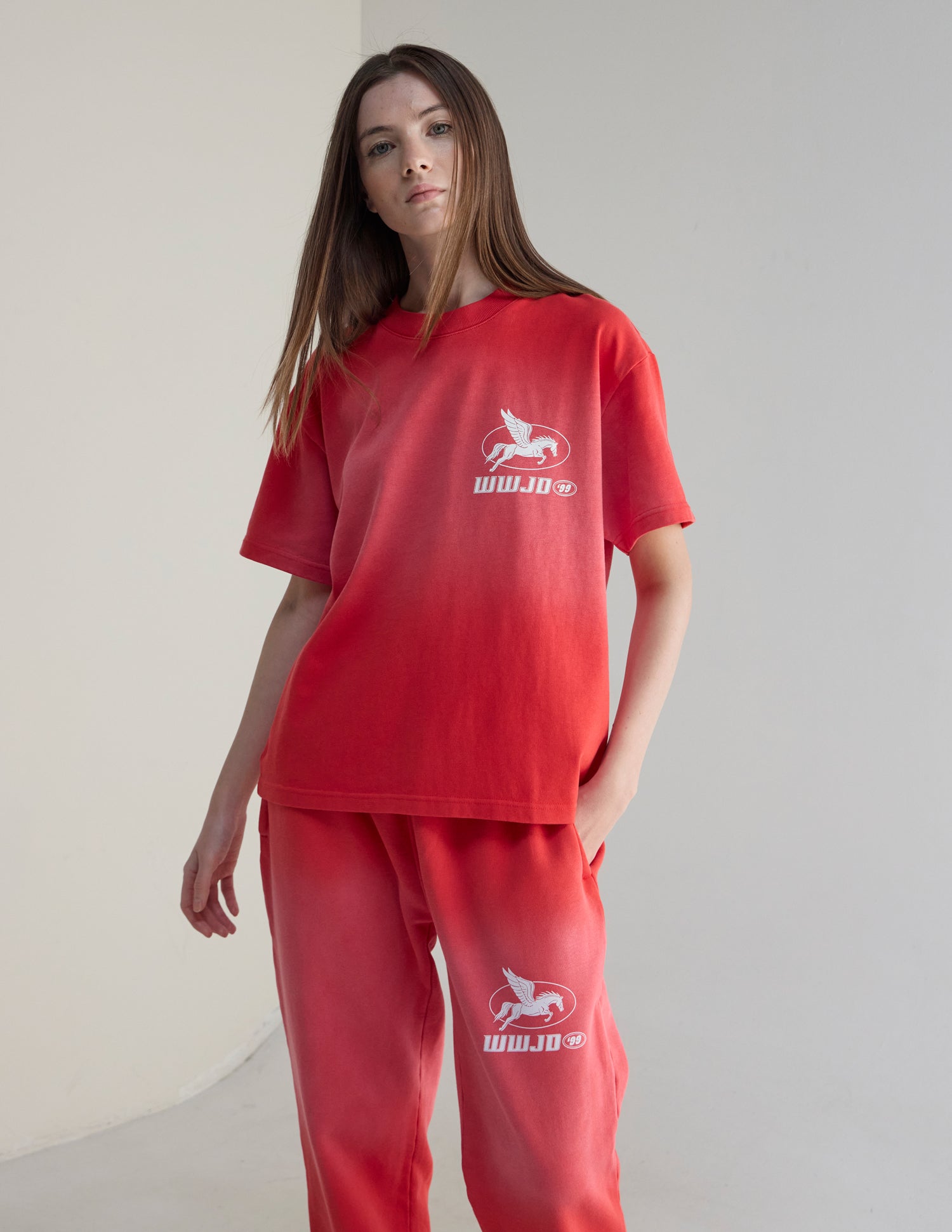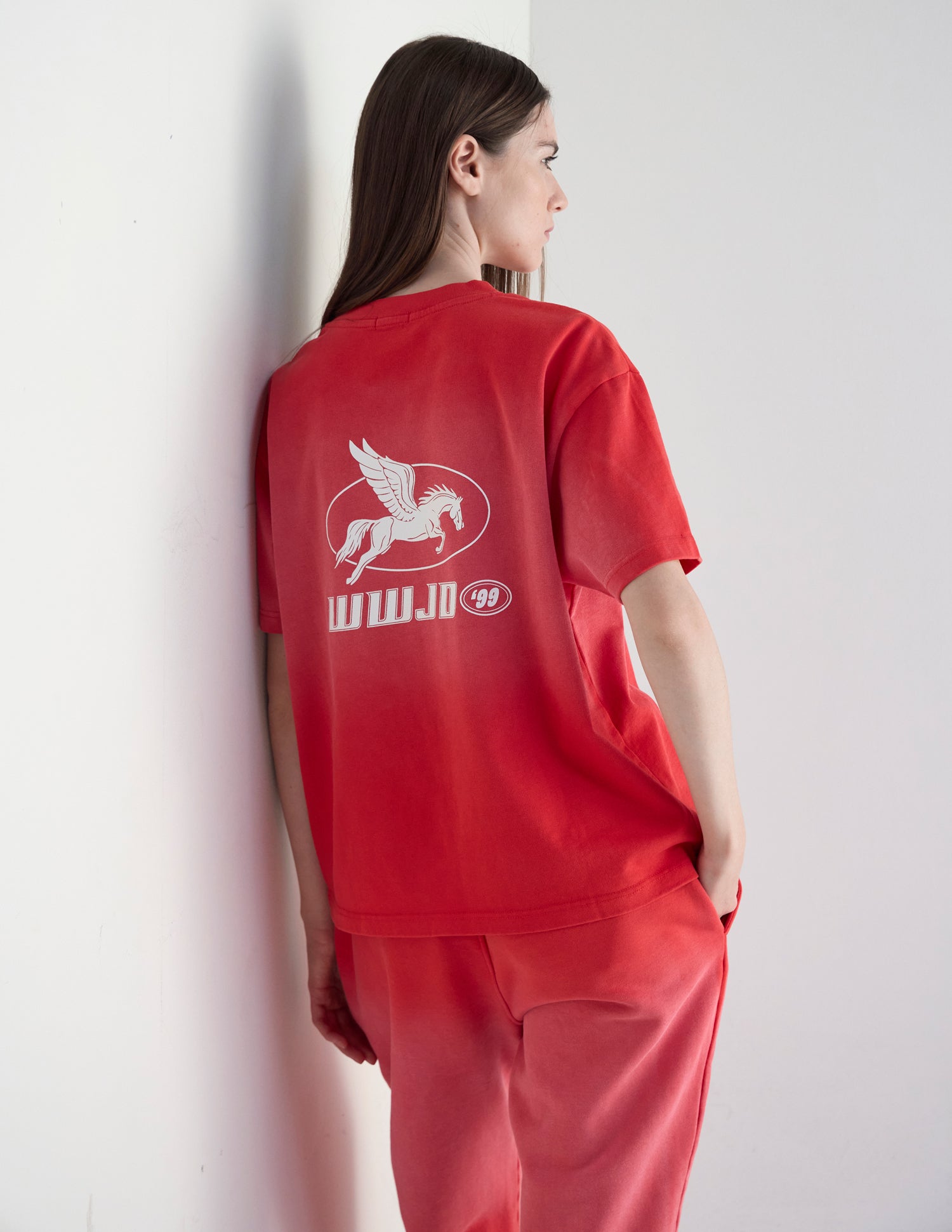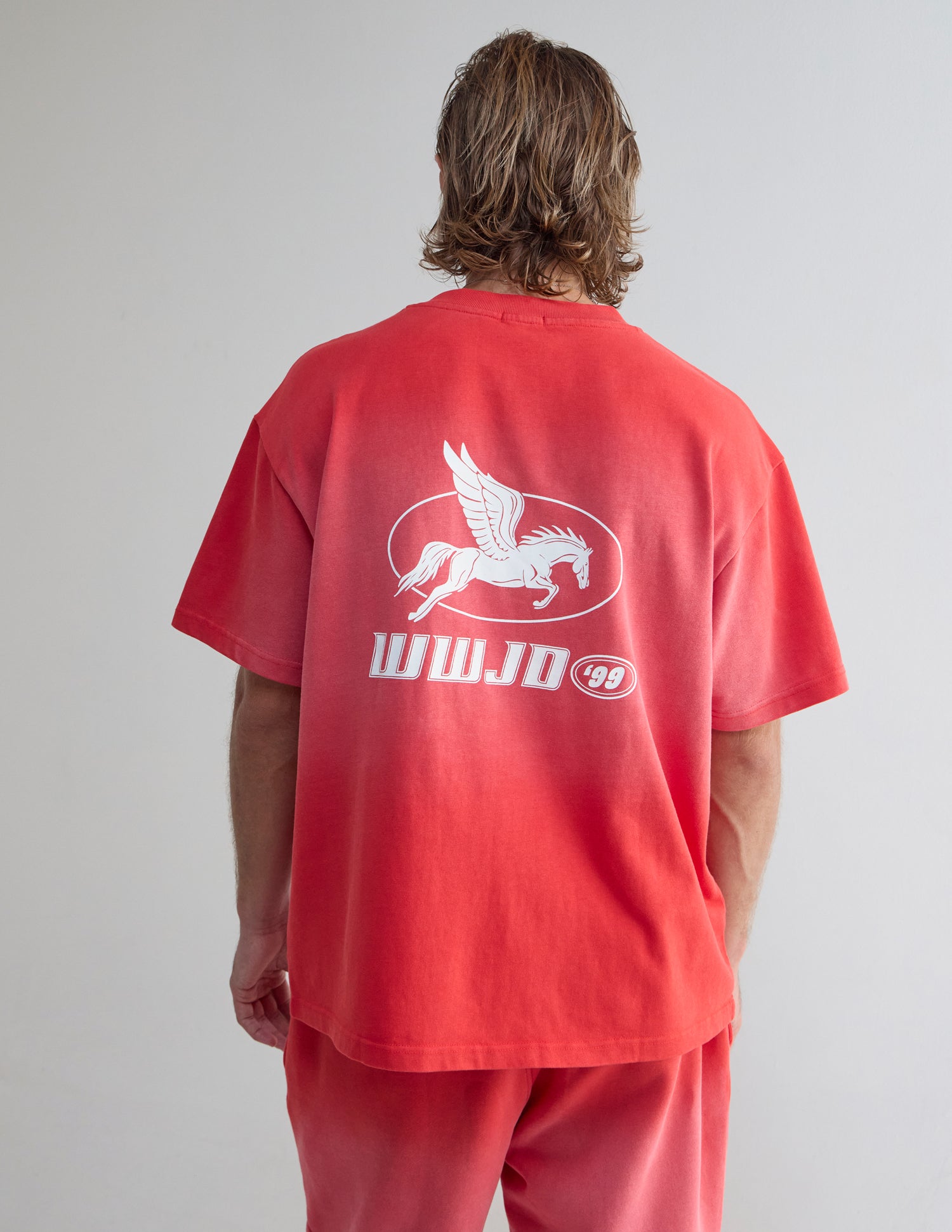 Our WWJD '99 Heavyweight Tee in coral clay. 100% premium combed cotton. 350gsm. WWJD '99 front and back print.