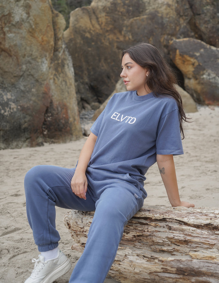 Our Heaven on Earth Heavyweight Tee in vintage navy. 100% premium combed cotton. 350gsm. ELVTD logo front puff print, Heaven on Earth back puff print. An everyday essential.